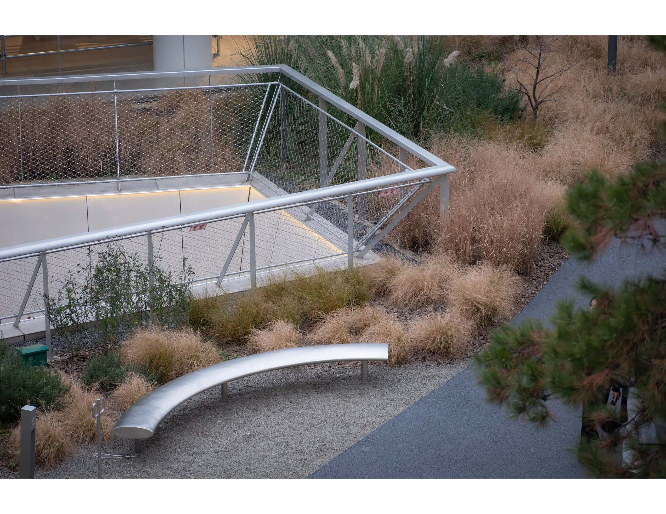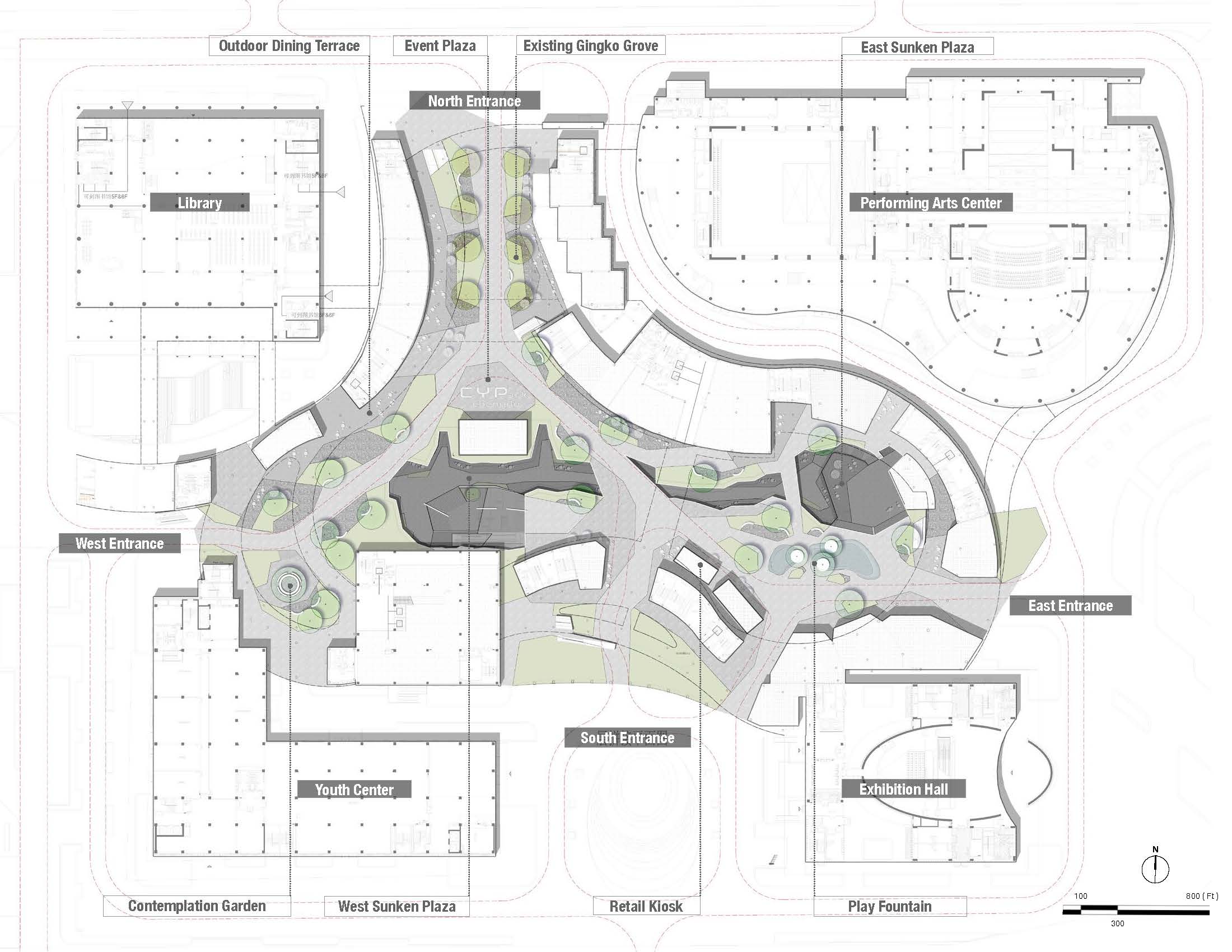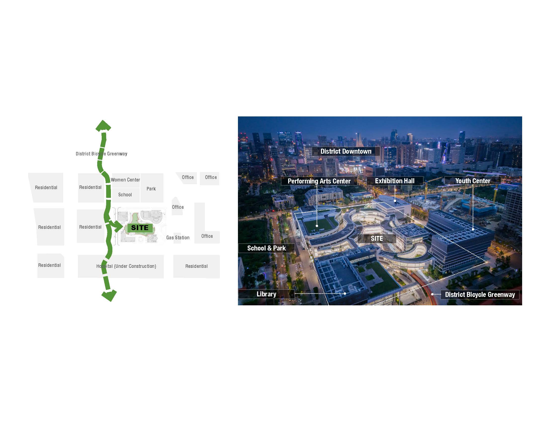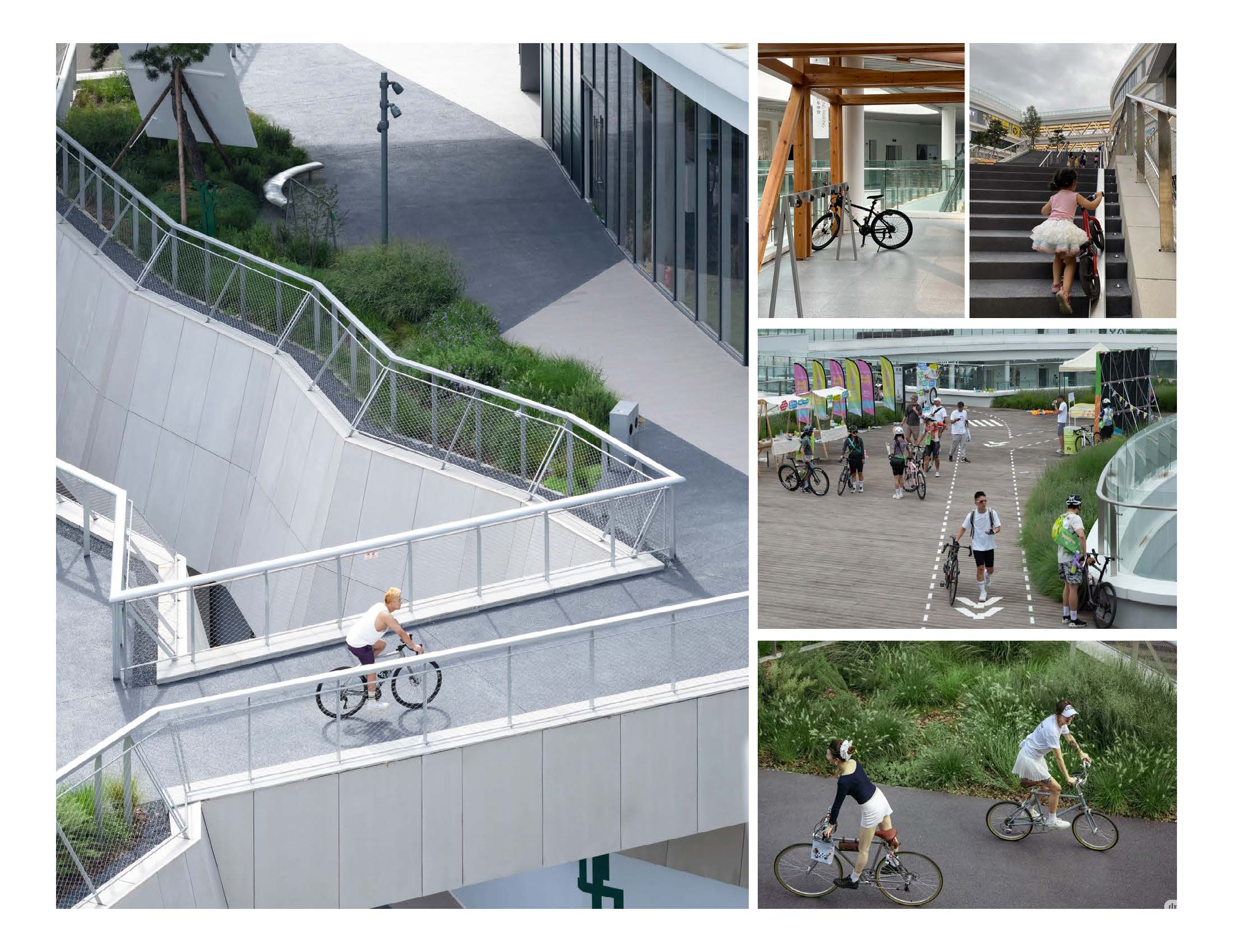 CyPARK is prioritizing and encouraging a green arrival bicycle + pedestrian for the public. A 5.4-mile north-to-south greenway connects adjacent 23 neighborhood blocks to the site via the west entrance, allowing a vehicle-free access for residents nearby. Therefore, no car parking except for handicapped is designed, leaving more space for landscape to help mitigate runoff.