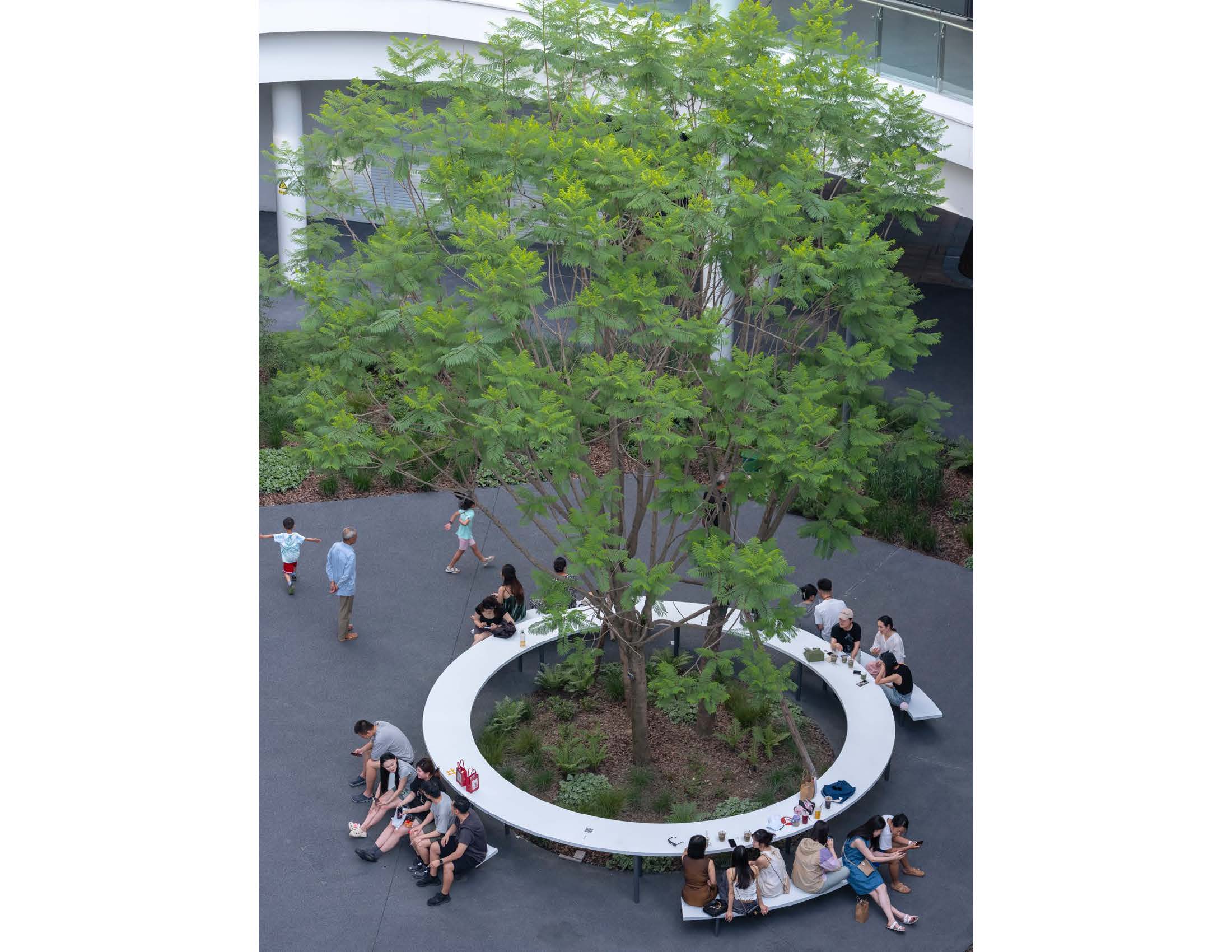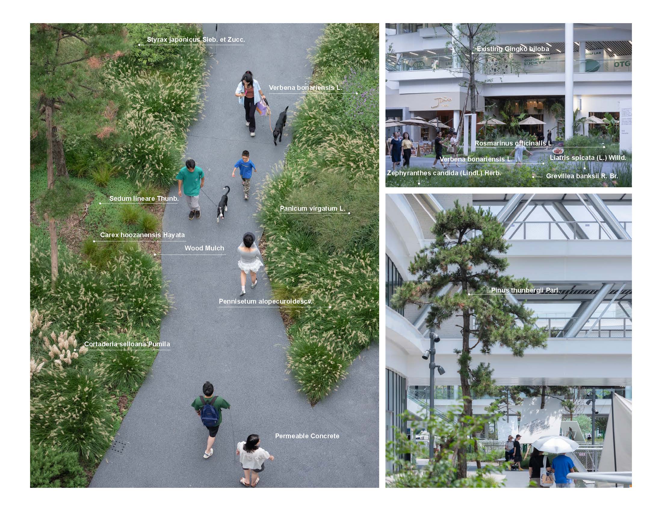 The redesign introduces a refreshing new landscape of a valley-like nature experience. In contrast to the dense and harsh urban ‘concrete forest’, wildness, originality, rawness, roughness and fresh tastes of plants comprise the sensational vibe of leisure experience without any manicured landscape. The two-level shopping stores are embraced by these natural green with a canyon-like void in the center of the site, offering a great visual experience no matter looking up or peering downwards. These characters attract people for photographing and promotion on the internet, leading to a larger influence and increasing retail revenue.