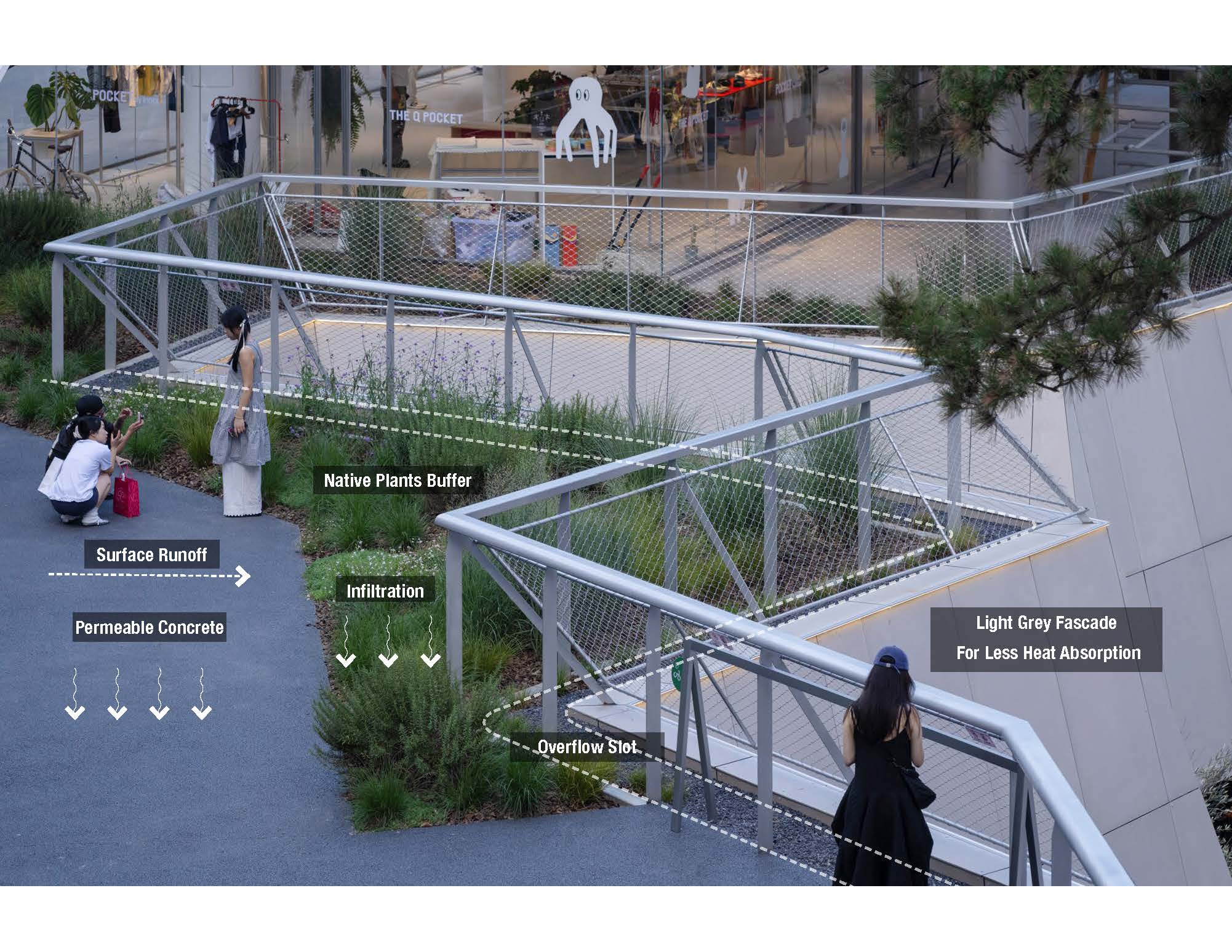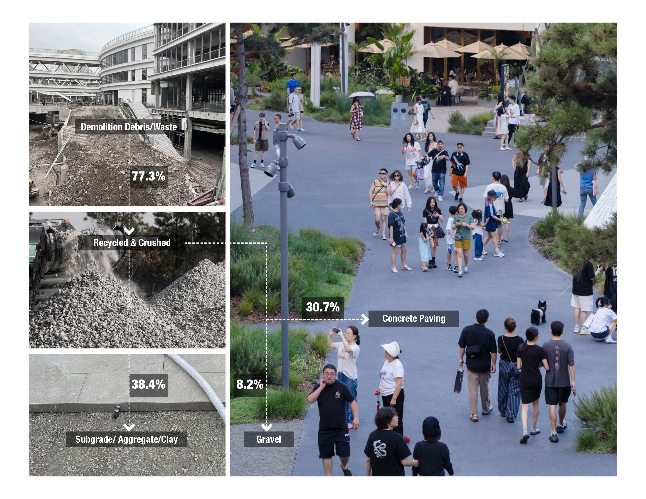In the pursuit of sustainable urban renewal, the integration of recycled concrete and steel from demolished structures into foundational layers for the ground paving, such as aggregate subgrade, which reduces waste and minimizes the carbon footprint of construction. Above this resilient base, 80 % permeable concrete paving and all gravel paving were also regenerated from the demolition waste after being crushed and stirred, allowing rainwater to infiltrate the soil naturally, mitigating site flooding. By utilizing existing drainage systems and minimizing new-built drainage, projects not only cut costs but also preserve the hydrological balance of the surrounding sewage system.