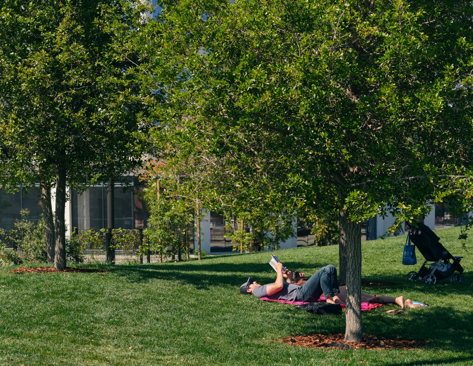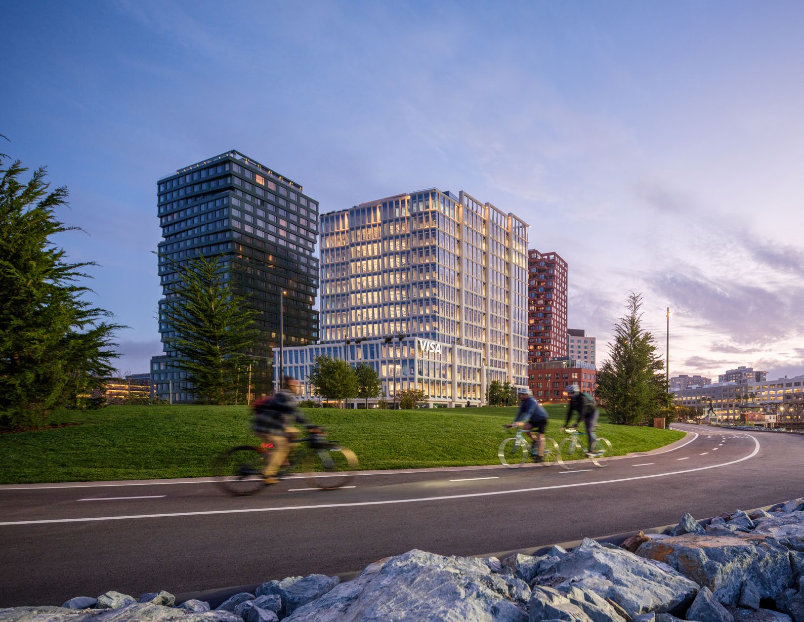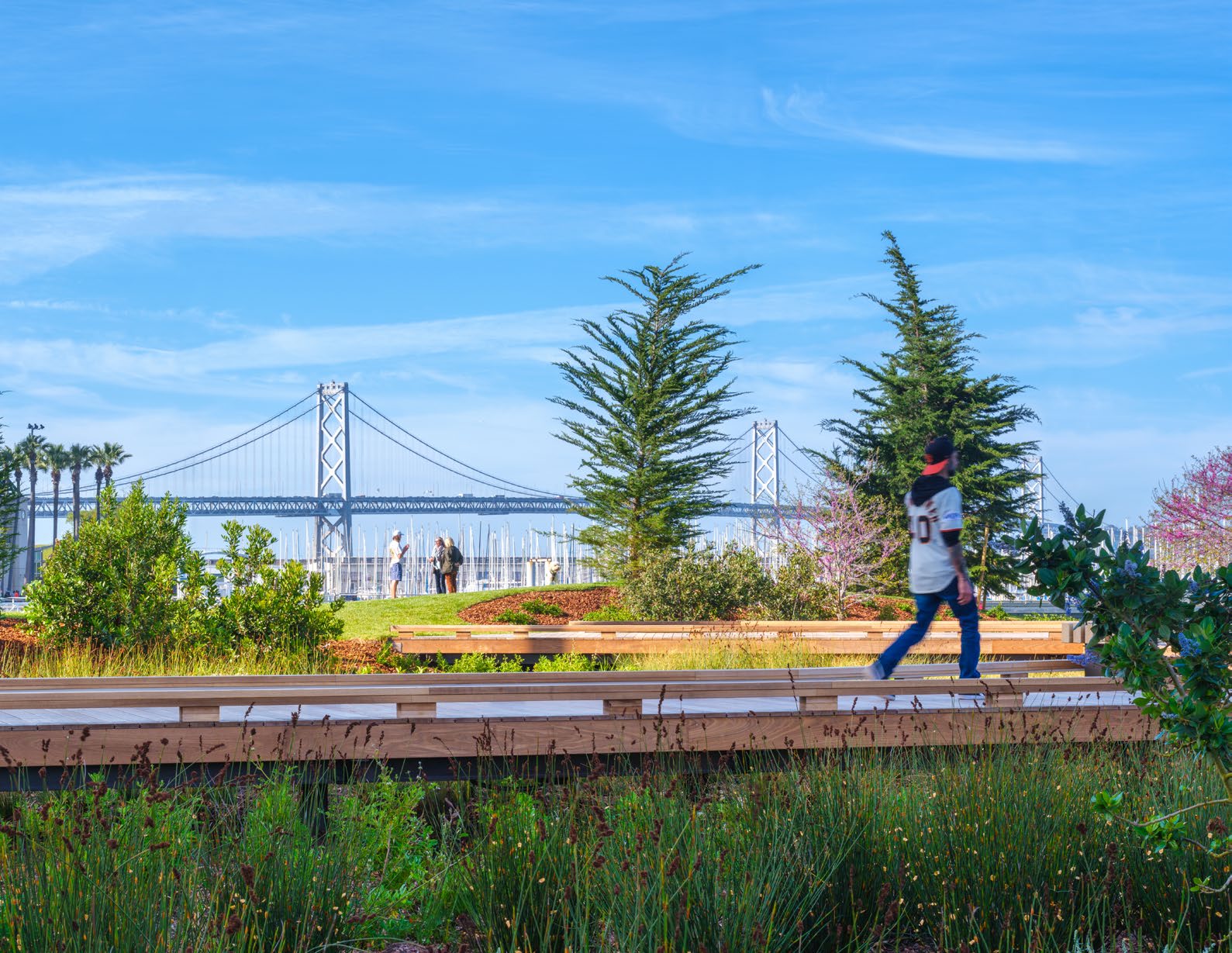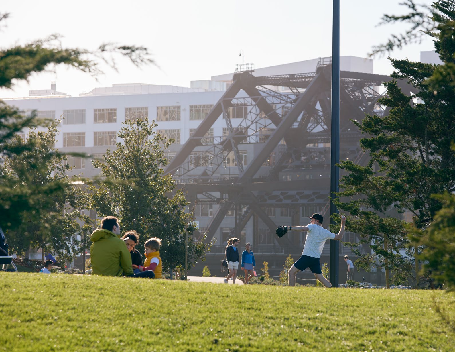 Framing views of the water, ballpark, skyline, and Bay Bridge, the Great Lawn offers one-acre of flexibly programmed space for play, gathering, picnicking, and reflection. Sculpted to create the illusion of undulating green space spilling into the water, the lawn is surrounded by Monterey cypress trees, reminiscent of the region’s iconic headland landscapes.