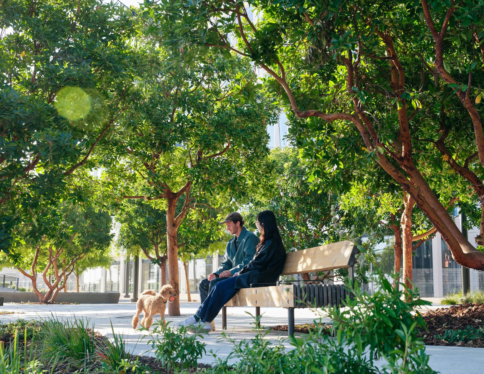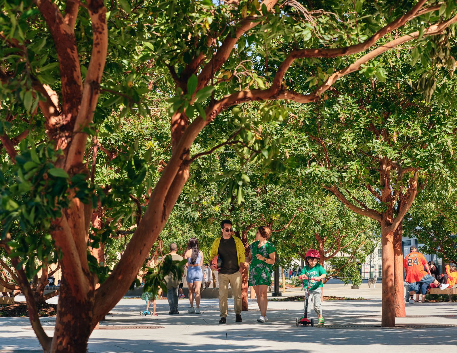 Each piece of the park magnifies San Francisco’s environs, forming distinct spaces within the park that come together as an iconic urban public space. At its western entrance, the park opens up to the Gathering Grove, shaded by native Arbutus trees and lit by catenary lights. The Gathering Grove is an ideal area for cultural events, fitness classes, music, art fairs, and other programs. Its trees also mitigate wind impacts along the western half of the park.