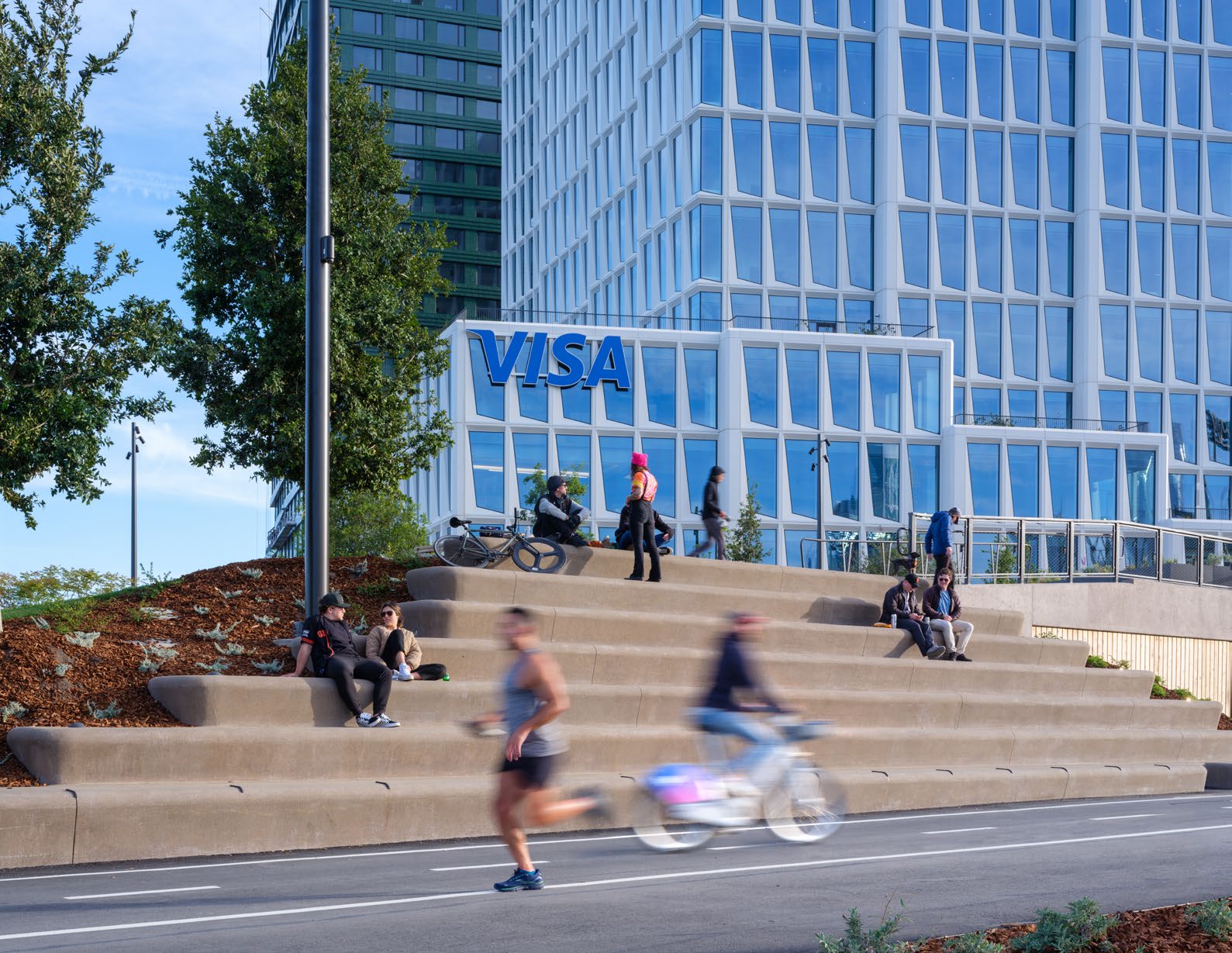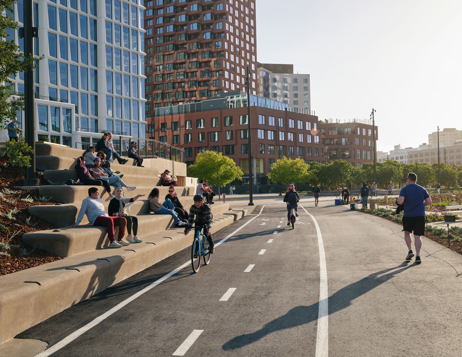 Just past the Grove, the Central Plaza captures the energy of the park, Mission Rock neighborhood, and surrounding communities. It features an all-gender restroom integrated into the landscape. To the north, the Shoreline Sands bring visitors closer to the waterfront. Inspired by textures of local beaches, the area features branches of reclaimed eucalyptus wood as interactive seating. Further east, with views of Oracle Park and the Shoreline Sands, the Stadium Seats allow groups to gather and watch the bustle of Oracle Park across McCovey Cove. The seats borrow the terraced form from the seating at the ballpark.