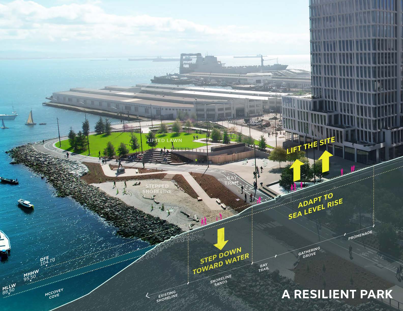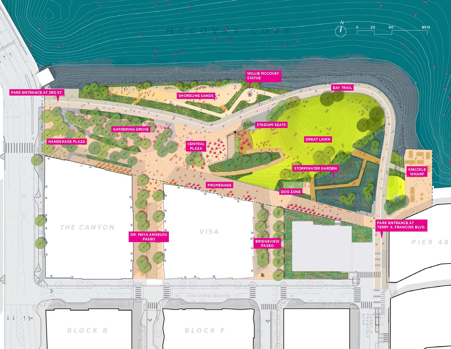 China Basin Park is a 5-acre waterfront park and cultural centerpiece of San Francisco’s new Mission Rock neighborhood. The mixed-use community sits just across McCovey Cove from Oracle Park, home of the San Francisco Giants. Each piece of China Basin Park magnifies local environs—the region’s headlands, coastal edges, and wetland ecologies are echoed throughout the design. The park offers diverse amenities: a sculpted lawn frames views of the San Francisco Bay to the east, a Central Plaza greets pedestrians from the south, a shady grove meets the more intimate scale of the basin to the west, and a stepped urban amphitheater faces the San Francisco Giants ballpark to the north. Designed to reduce risk from sea level rise and storm events, the park anticipates threats of climate change while connecting visitors to the water, providing expansive views, and creating an iconic destination for San Francisco.