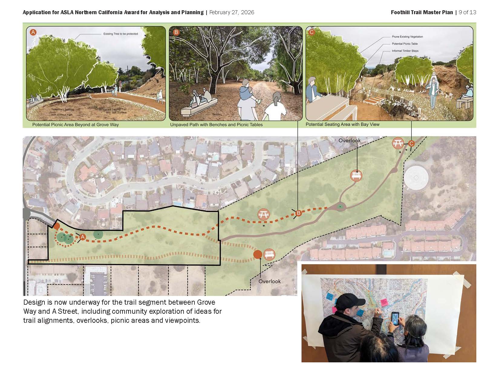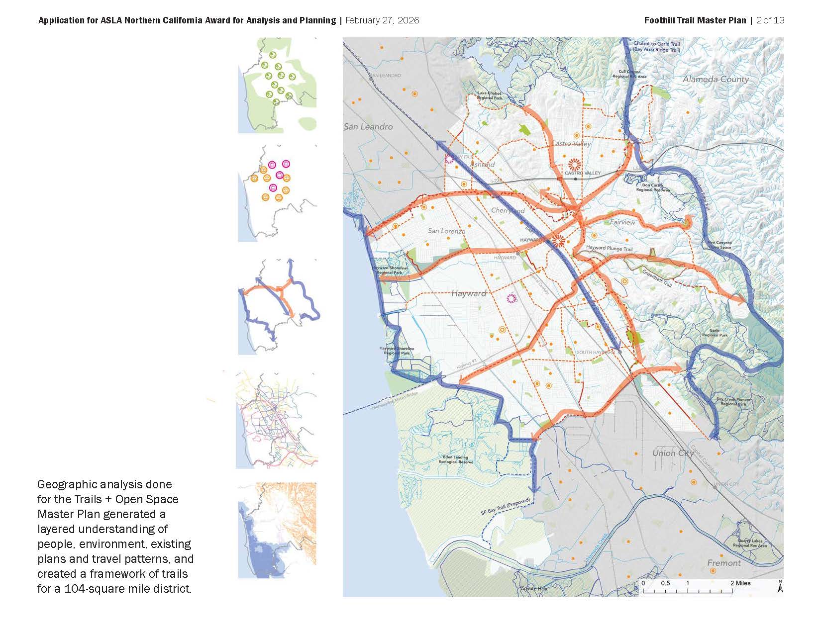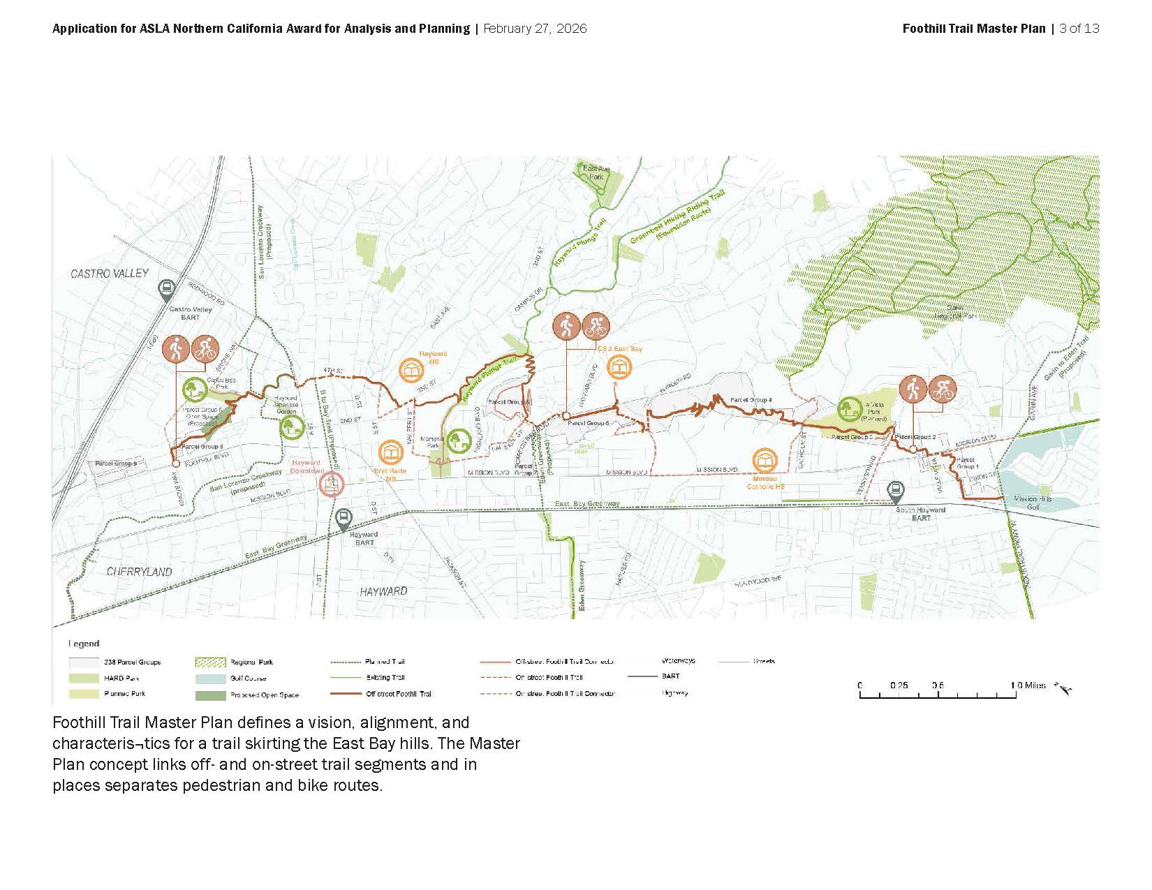 Foothill Trail Master Plan defines a vision, alignment, and characteristics for a trail skirting the East Bay hills in Hayward. The Plan was created in tandem with plans for a districtwide Trails + Open Space Master Plan and for the San Lorenzo Creekway. Foothill Trail, the legacy of a successfully- opposed freeway project, is a unique opportunity to stitch neighborhoods with their natural setting with a lasting recreational asset. The Plan is a critical step in realizing it over time. It gives the trail a detailed alignment, specifies trail types, widths, and amenities, and sets the stage for public projects and segments created with private development. Site analysis carefully examines topography, landform, existing grading, trail connections, vegetation, and opportunities for landscape experience. The Master Plan exemplifies landscape architects‘ engagement with a complex and fragmented environment, and our potential to contribute to a community’s health and connection with place.