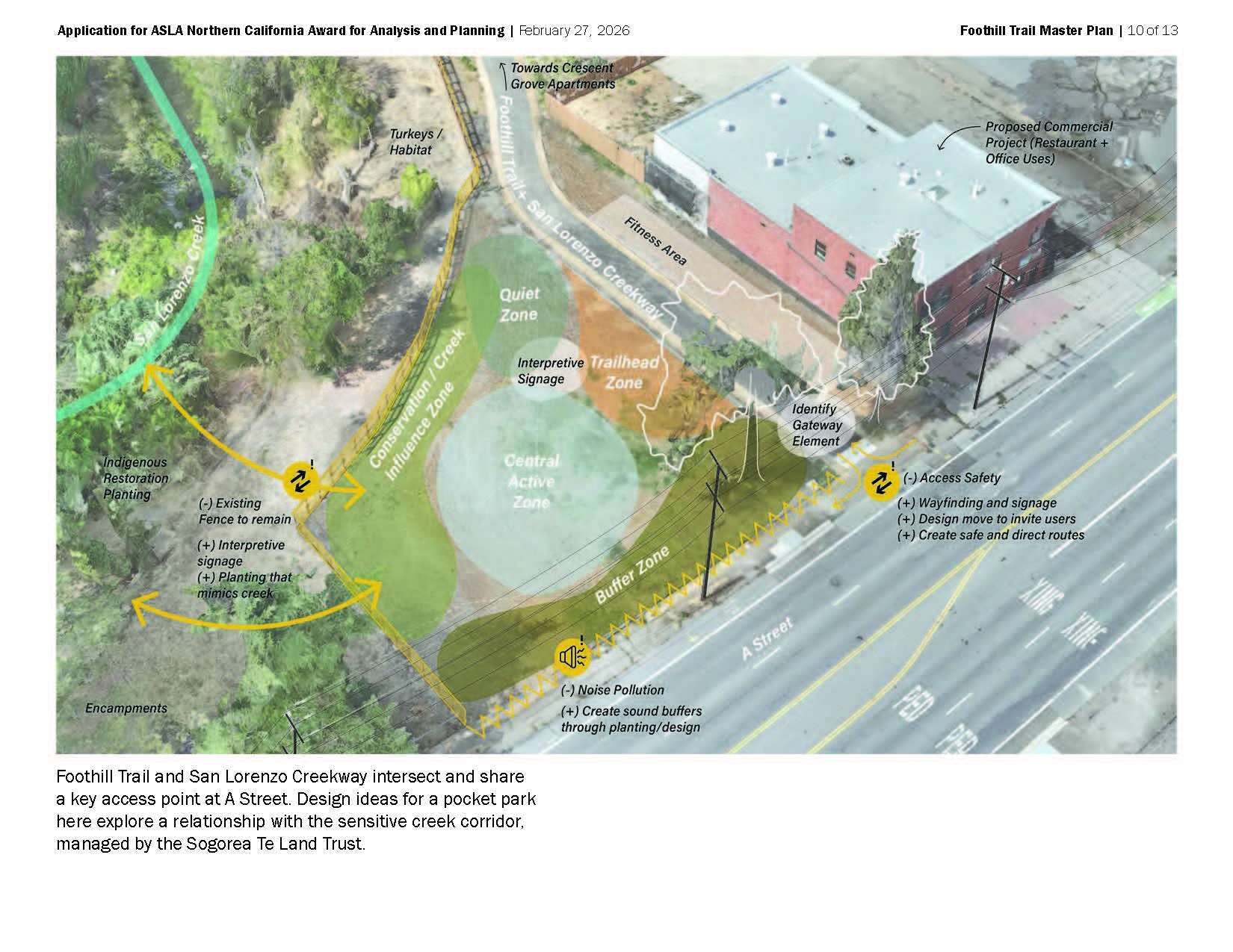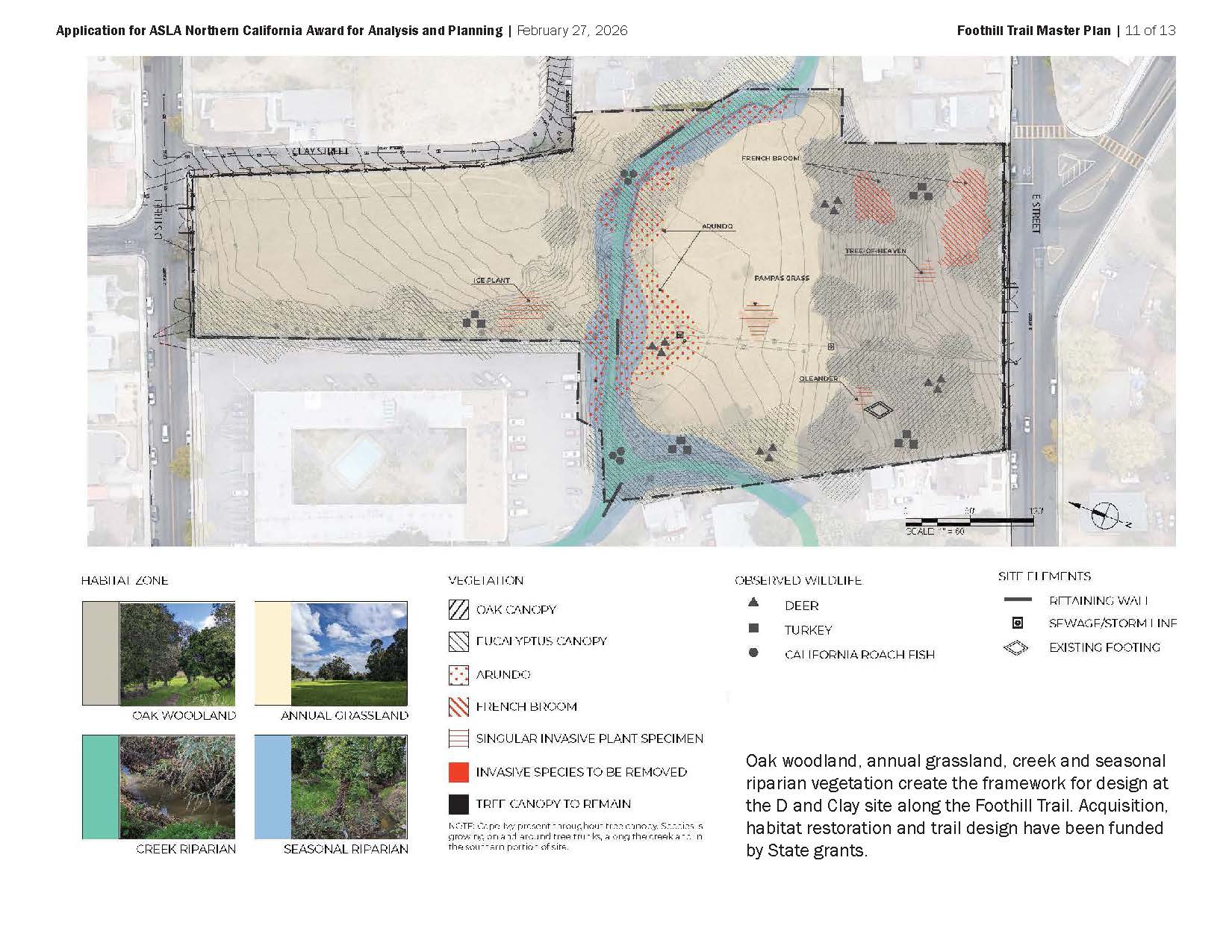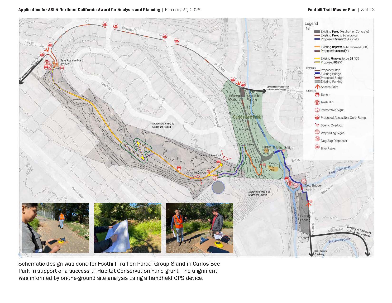 Foothill Trail Master Plan defines a vision, alignment, and characteristics for a trail skirting the East Bay hills in Hayward. The Plan was created in tandem with plans for a districtwide Trails + Open Space Master Plan and for the San Lorenzo Creekway. Foothill Trail, the legacy of a successfully- opposed freeway project, is a unique opportunity to stitch neighborhoods with their natural setting with a lasting recreational asset. The Plan is a critical step in realizing it over time. It gives the trail a detailed alignment, specifies trail types, widths, and amenities, and sets the stage for public projects and segments created with private development. Site analysis carefully examines topography, landform, existing grading, trail connections, vegetation, and opportunities for landscape experience. The Master Plan exemplifies landscape architects‘ engagement with a complex and fragmented environment, and our potential to contribute to a community’s health and connection with place.