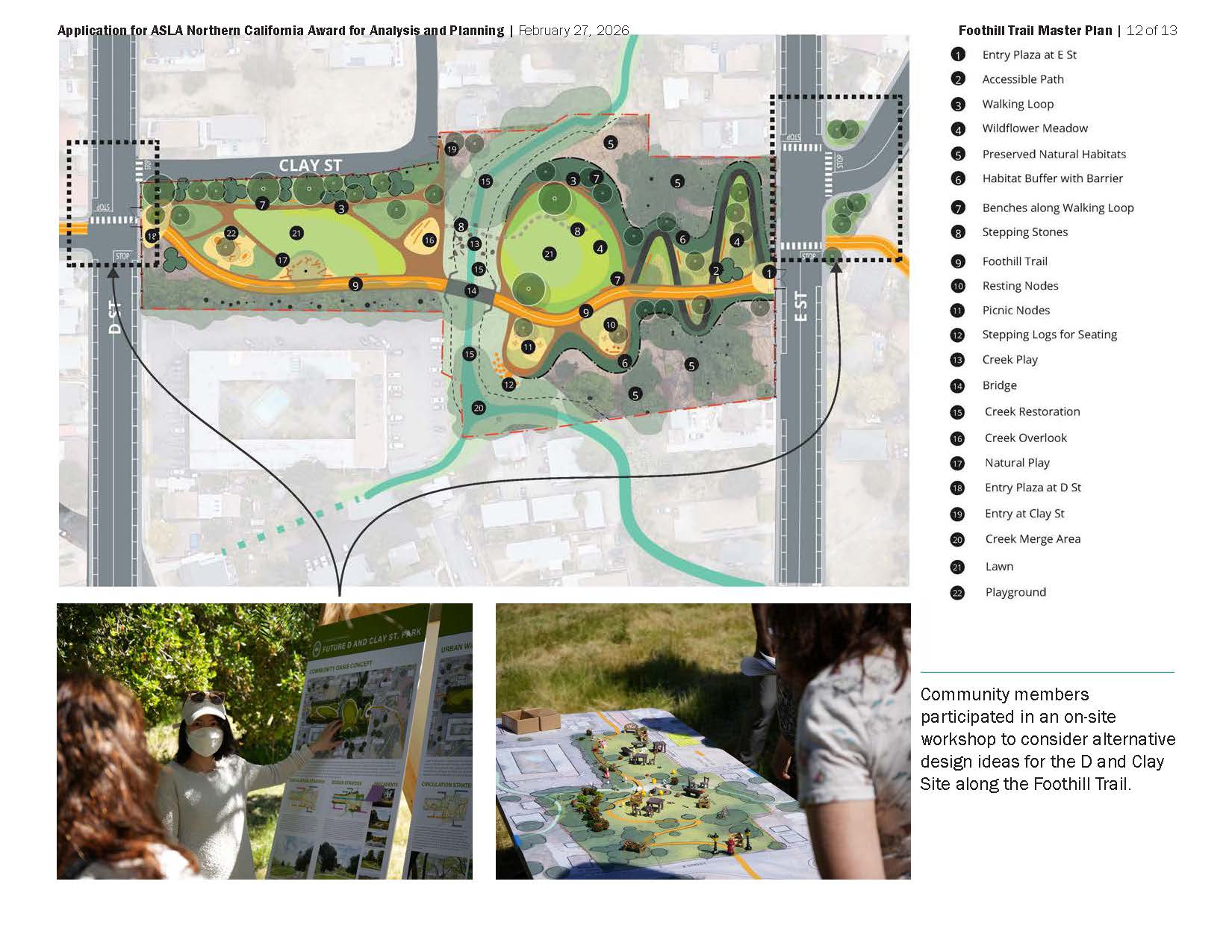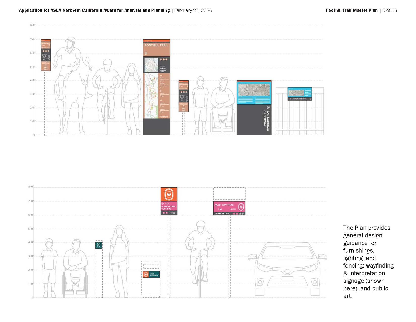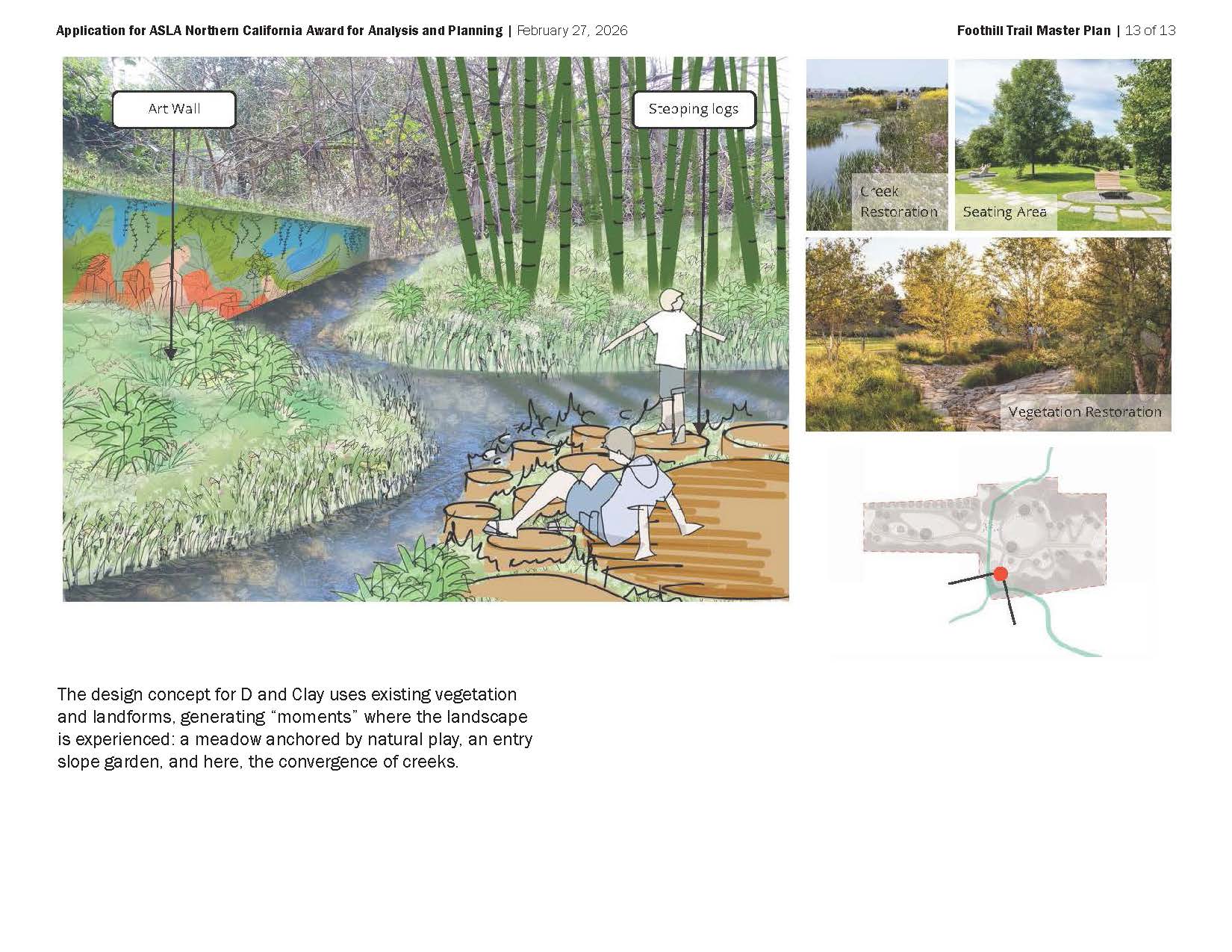 Quality of Design and Execution. The Plan addresses critical characteristics (e.g. user mix, width, materials, land use context) for each trail type, including both off- and on-street conditions. Access points are indicated, and amenities and site relationships are illustrated. FTMP has been followed by design work on two segments: the D and Clay site near Downtown Hayward and the Grove Way to A Street segment crossing multiple properties and jurisdictions. Here, conceptual design uses existing vegetation and landforms, sculpting open view corridors framed by stands of oaks and eucalyptus, braiding trails to explore small but environmentally diverse sites, and generating “moments:” a meadow anchored by natural play; the convergence of creeks; an entry slope garden; a seating area with a bay view; a trailhead pocket park.