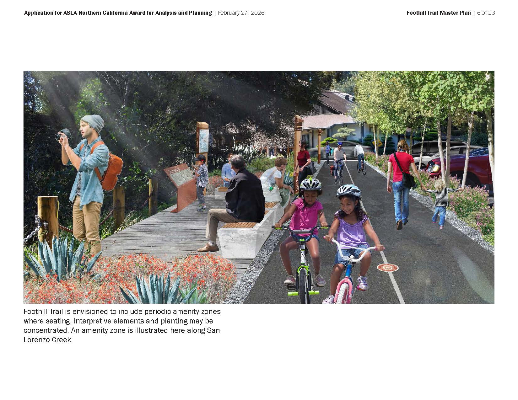 Relevance and Impact. Foothill Trail exemplifies landscape architects‘ engagement with a fragmented urban environment and with the complexity of implementation through public and private development. It addresses landscape repair, environmental awareness, and opportunities for active recreation close to home. The trail and associated open spaces provide an opportunity to be physically active, immersed in the natural world, and connecting with others.