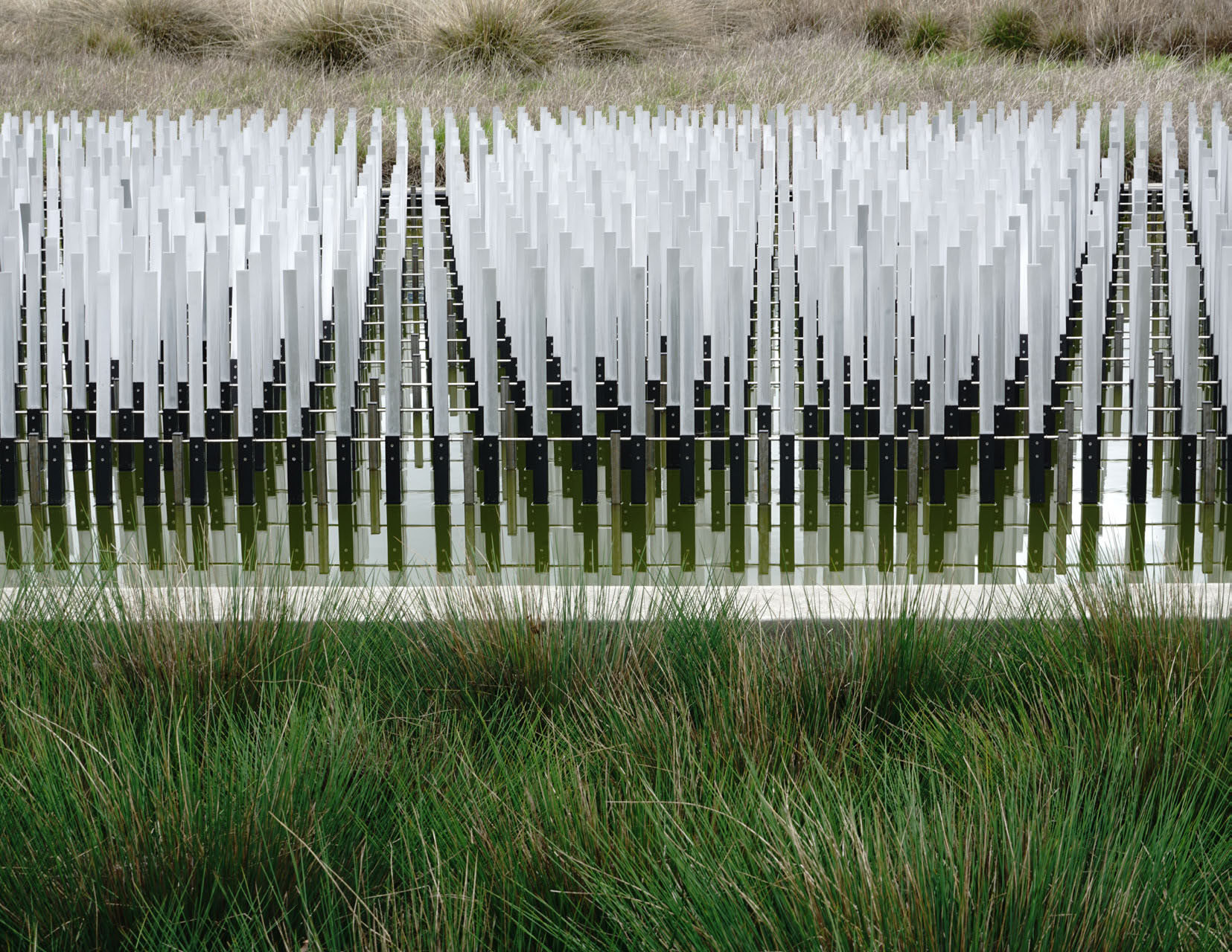 In stark contrast to the adjacent campus landscapes lined with high-water use and non-native plants, native and drought-tolerant plant species were carefully selected for this project to reactivate the site’s biodiversity using upland and aquatic species. Grown in special native plant nurseries, the new plants were hand-planted in the wetland and are subject to an extensive monitoring plan for long-term sustainability. Today the wetland surges with life. Shallow layers of water fill the microtopography of the wetland. Migratory and resident birds, invertebrates, rodents, and mammals are now finding and establishing themselves in its niches. The wetland is evolving, and people are welcome to watch and understand it over time. A trail around the seasonal wetland includes interpretive elements and educational signage. And a kinetic sculpture that engages dynamic wind patterns animates the site entry. It is a welcoming public gesture that invites the community to experience the ecological park and learn about the environmental and technological forces at play.