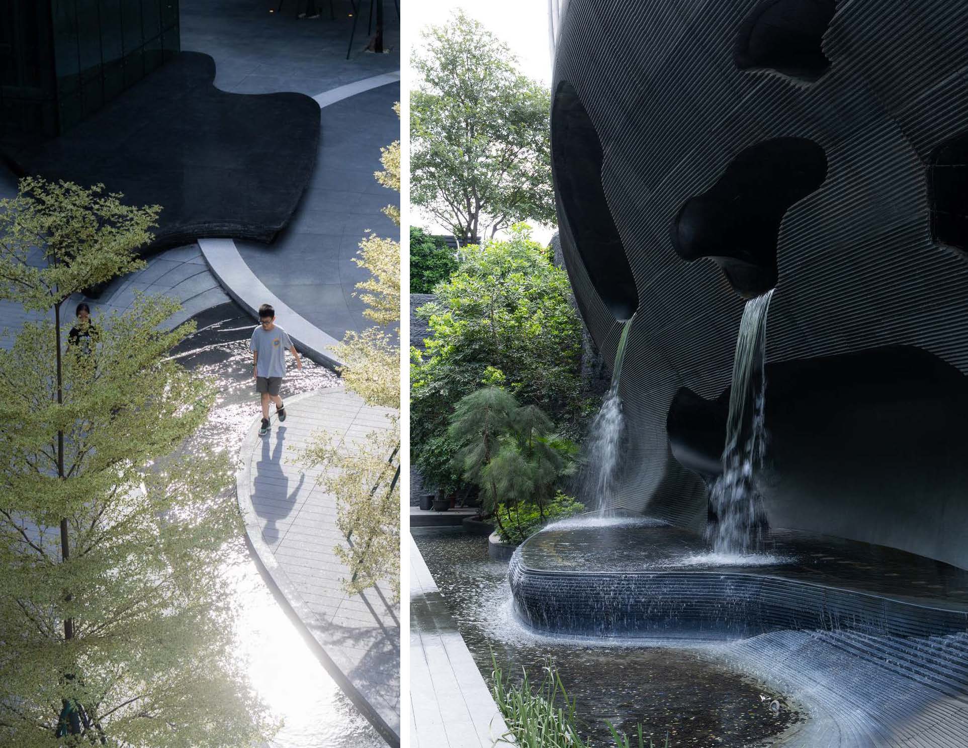 The water narrative continues into the retail courtyard, linking seamlessly with the cantilevered swimming pool above, which is complemented by a 14m sculptural water droplet envisioned as falling from the towers. This transition transforms the stone materiality into a fluid, watery plane. A mist fountain introduces an interactive and imaginative play element for children, reinforcing the theme of water’s dynamic presence. Additionally, white stepping stones take inspiration from the traditional Chinese “meandering waterway” garden design element, allowing water to flow elegantly through the stone, creating an effect reminiscent of calligraphy. This fusion of art, nature, and playfulness transforms the urban landscape into an immersive and interactive experience, enabling visitors to reconnect with organic forms amid the modern cityscape.
