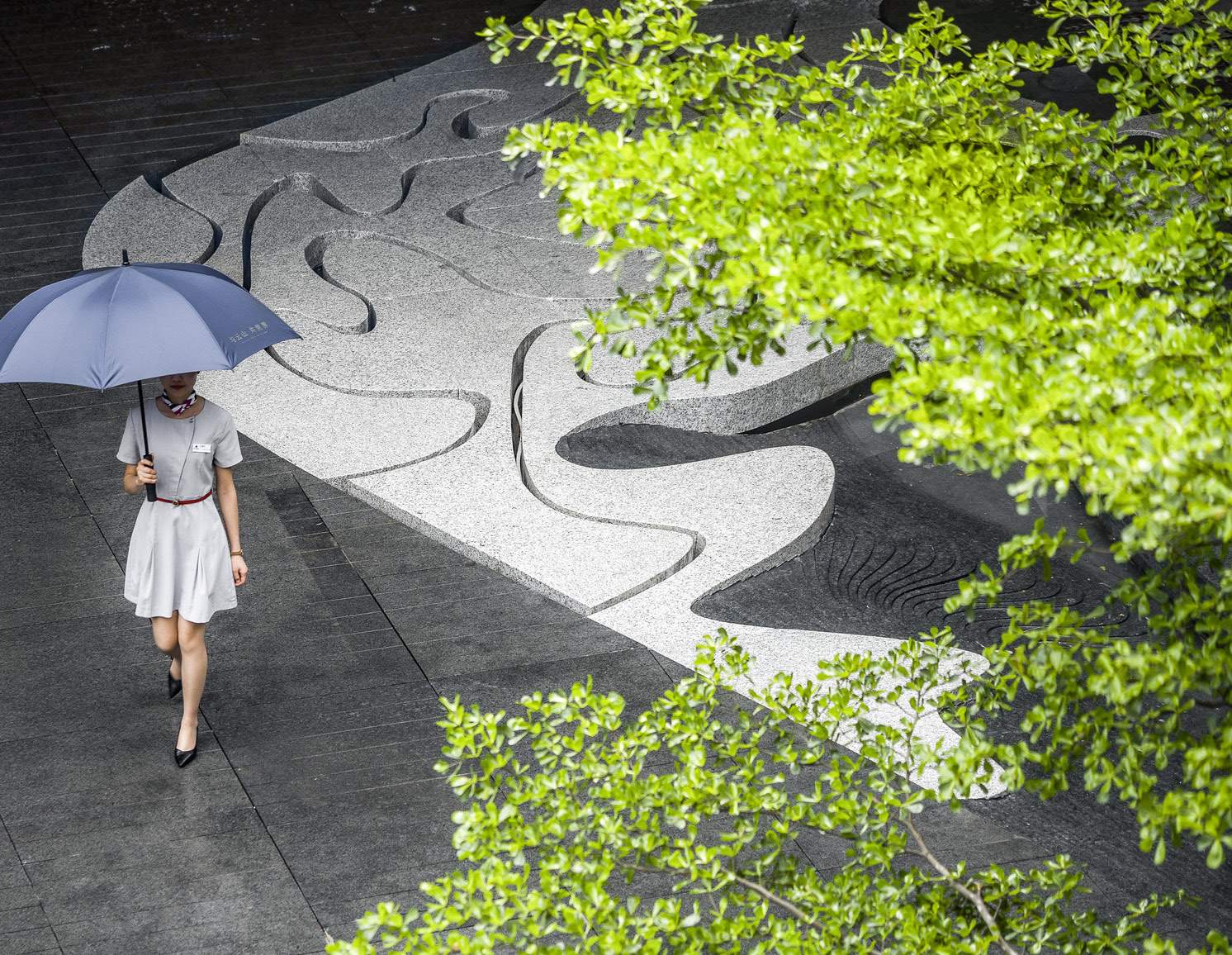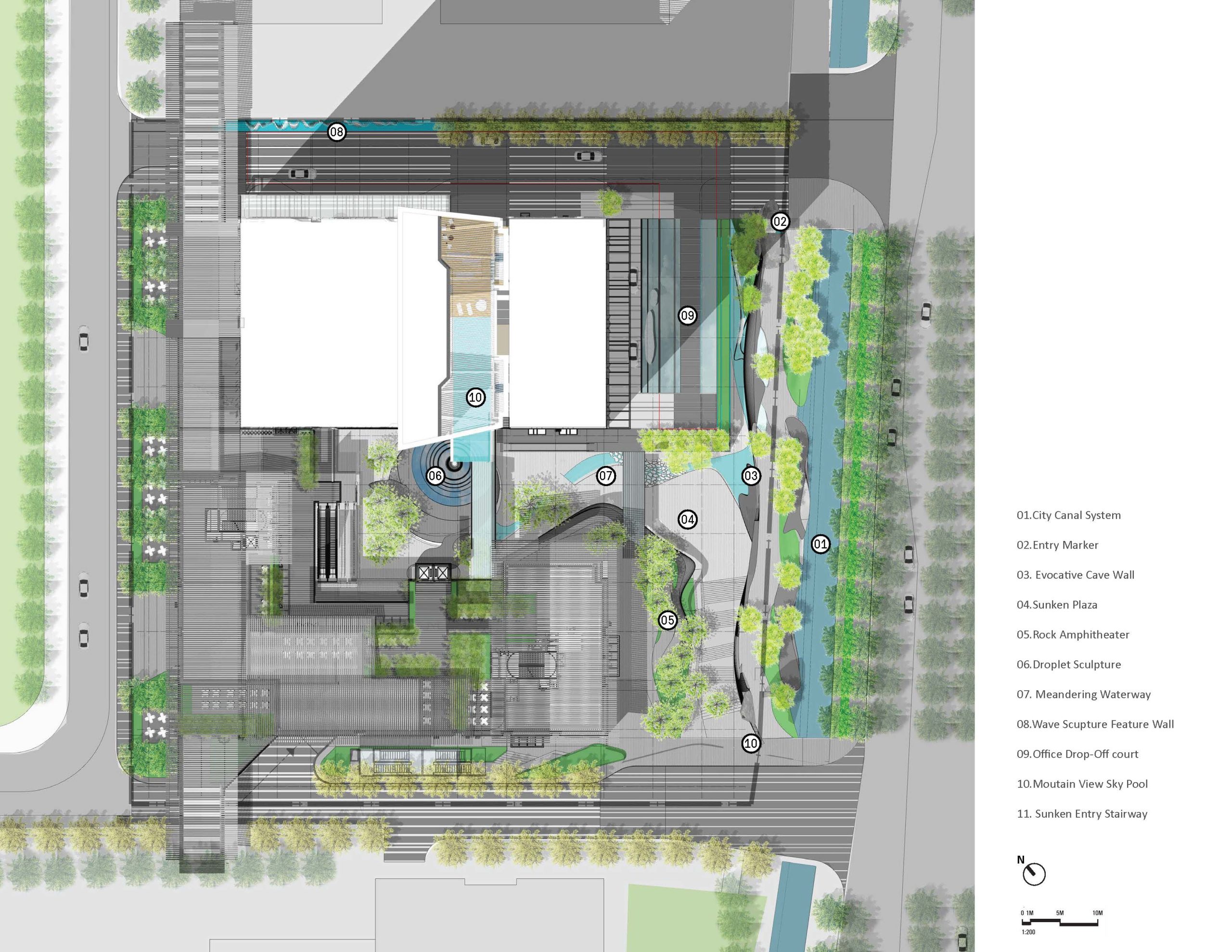 Jianhua Center redefines landscape as environmental art—an expressive medium that bridges human perception, natural beauty, and urban form. Inspired by the stark contrast between Baiyun Mountain’s pristine watershed and the rigid, engineered canal adjacent to the site, the design team envisioned a landscape that restores the fluid dynamism of water. Rather than accepting the site’s existing concrete channel, the project imagines an alternative narrative—one where water once freely shaped the land, carving spaces for human interaction and reflection. The sunken retail courtyard becomes an evocative “cave,” where sculpted stone walls echo the erosive power of flowing water. Through this immersive experience, visitors reconnect with nature’s organic forms, expanding their imagination of water’s timeless journey. By integrating artistic expression of geologic phenomena into public space, Jianhua Center challenges conventions and redefines the role of landscape architecture in the built environment.