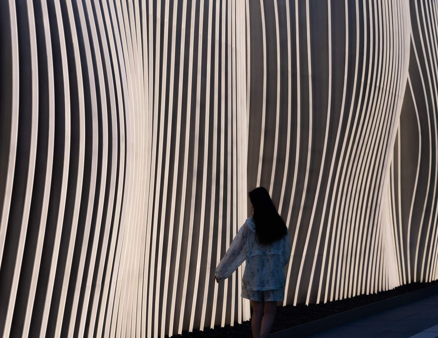 Representing the beauty formed by nature was only possible with the use of CNC technology. The etch design team developed a mechanically hung facade system composed of 60 unique sections, meticulously designed in a 3D model and cut into more than 5,000 distinct stone pieces using CNC machinery. Each stone piece was etched with 30mm contour lines to reinforce the curvaceous shape, creating an effect that mimics natural water erosion. The eroded holes were polished to contrast with the rougher stone surfaces, exaggerating the different qualities of natural formations. With the help of advanced fabrication technology, the construction achieved an extraordinary level of precision and craftsmanship, seamlessly translating the fluidity of water into a built environment.