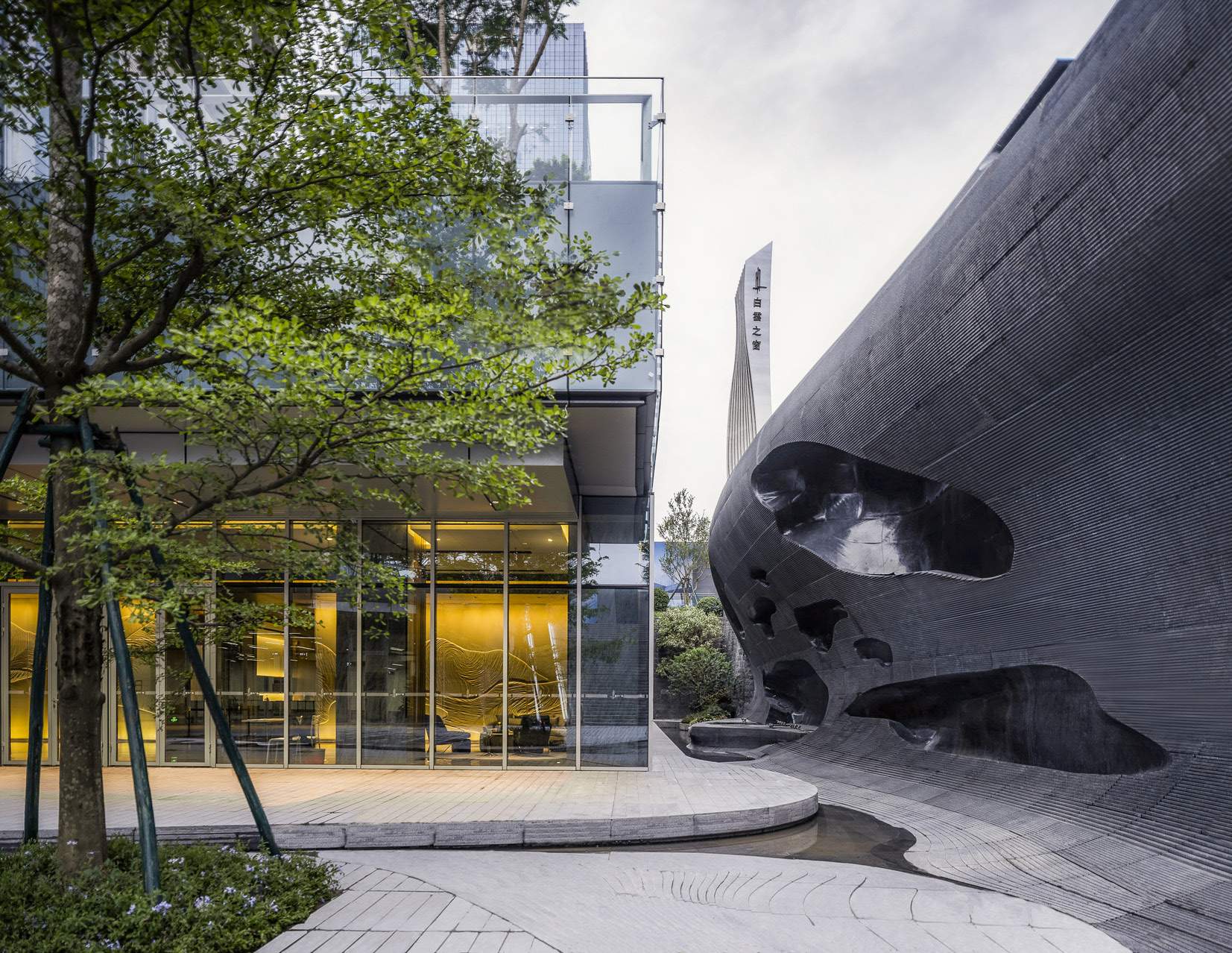 This development project consists of two architectural towers—one designated as the future headquarters of Jianhua Building Materials Group and the other as a residential tower with a retail podium. These two towers are connected by a transparent cantilevered swimming pool, while the retail podium features a sunken courtyard that descends to the basement level. The design team sought to integrate the natural beauty of Baiyun Mountain and the movement of water into people’s daily experiences within this urban center.