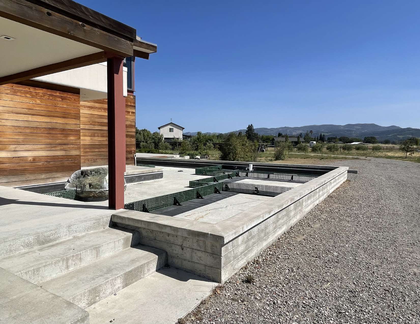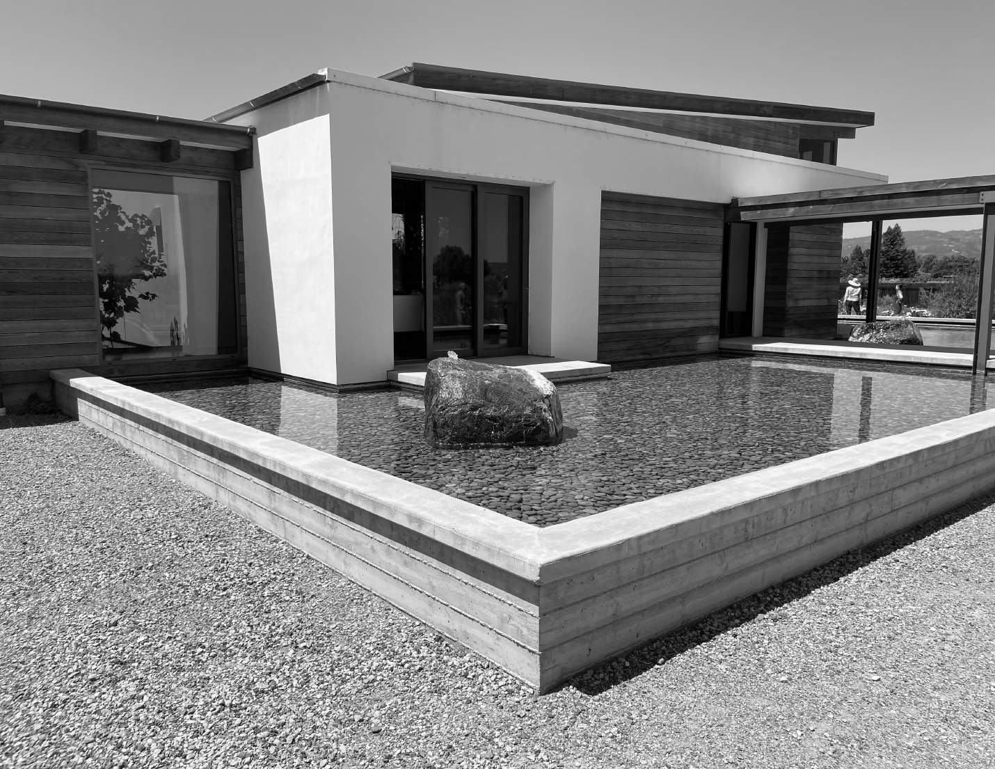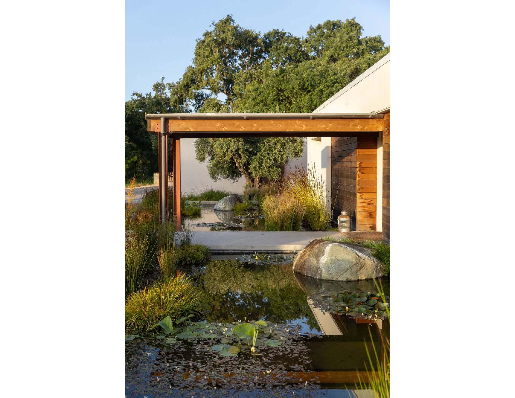 Flanking the entry walk and wrapping around two sides of this home outside the City of Sonoma was a contemporary concrete reflecting pool. Shallow, chlorinated and lined with Mexican beach pebbles, it felt more appropriate for an office park than for the country setting. We transformed the water feature into a living pond, re-using the concrete shell and three large existing boulders drilled for water recirculation, and existing plumbing and lighting where possible, to reduce waste to the landfill. We added overlapping rectilinear flow-through planters of fiberglass FRP panels at different water depths, filled with a special aquatic soil mix topped with gravel to keep the soil in place. Shallow aquatic planters and marginal planters support a diverse plant scape, reducing use of chemicals, creating habitat, and improving air quality, while creating a more welcoming entry to the home; a big impact for a relatively small investment.
