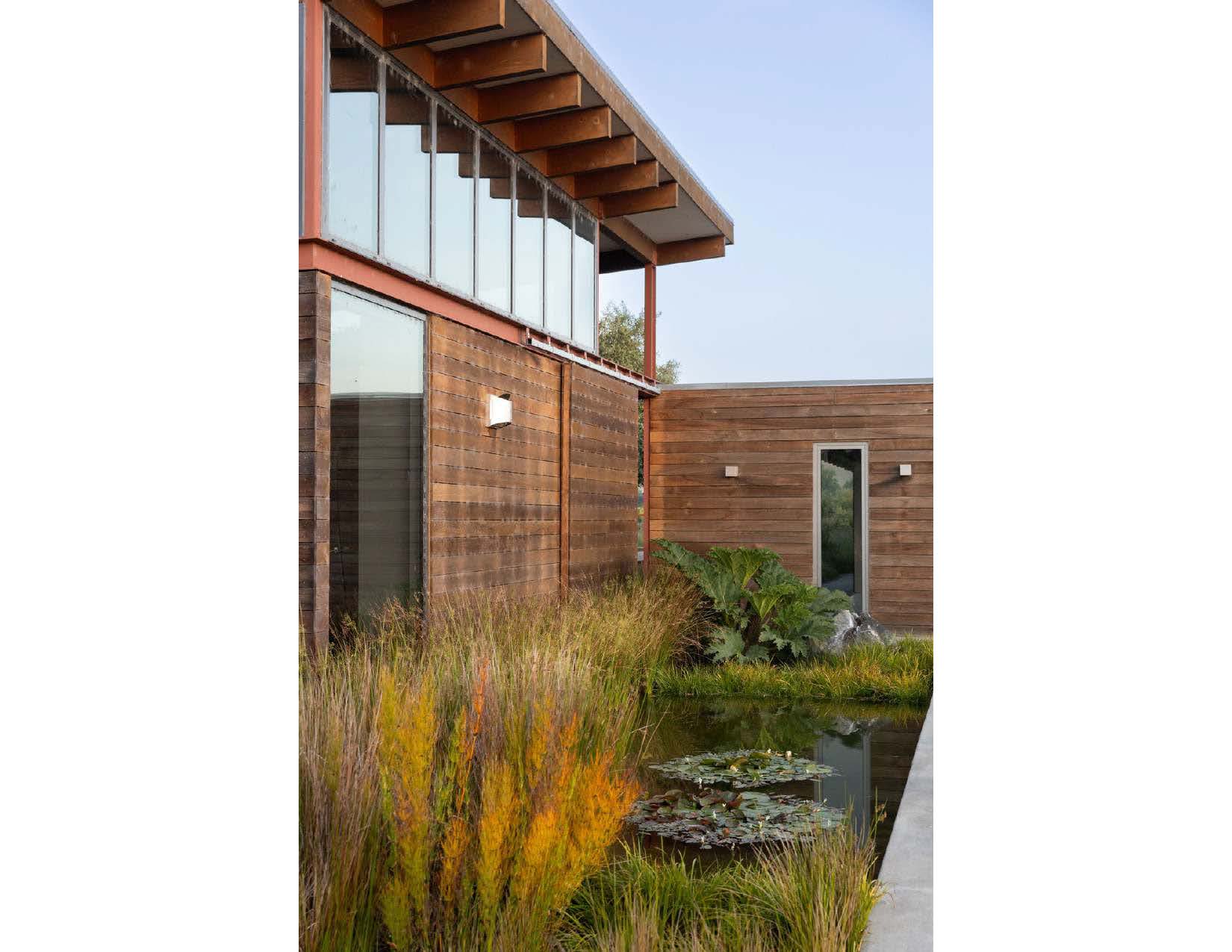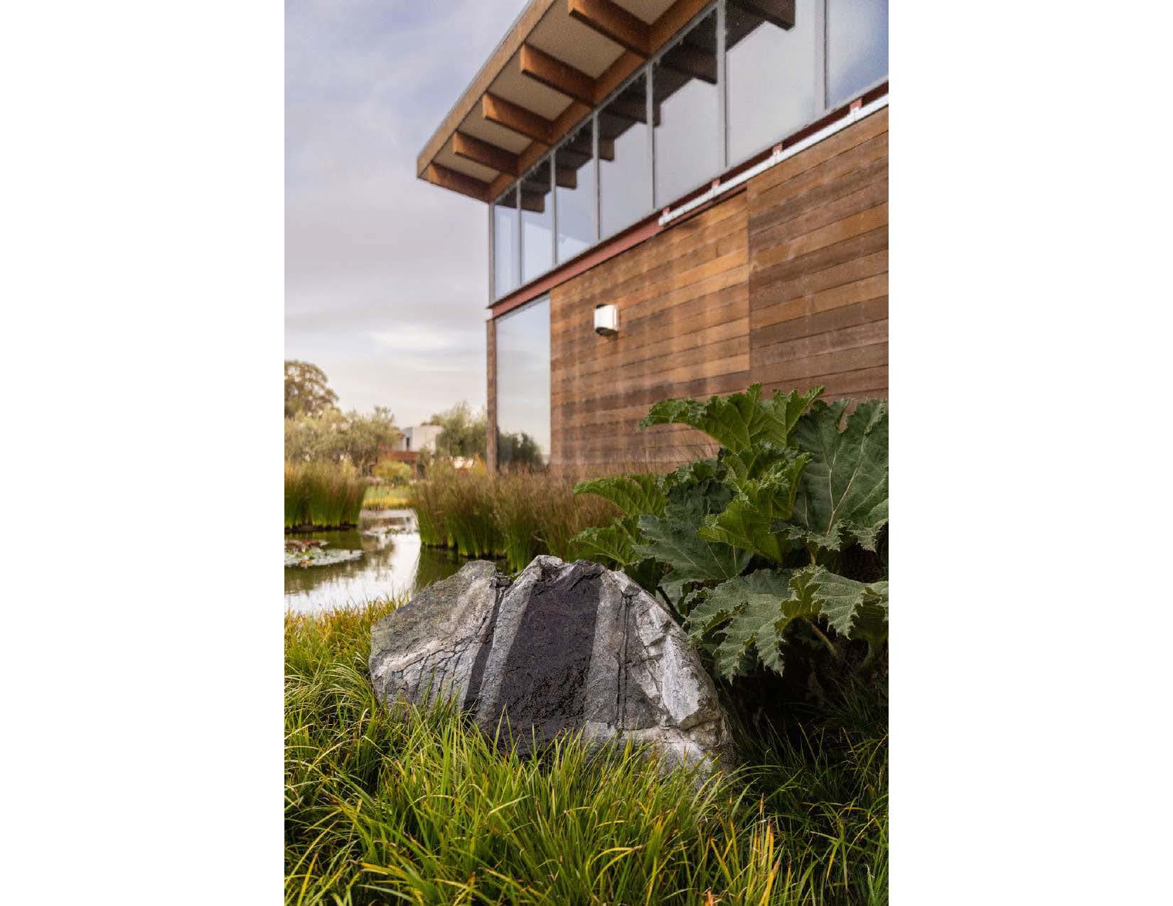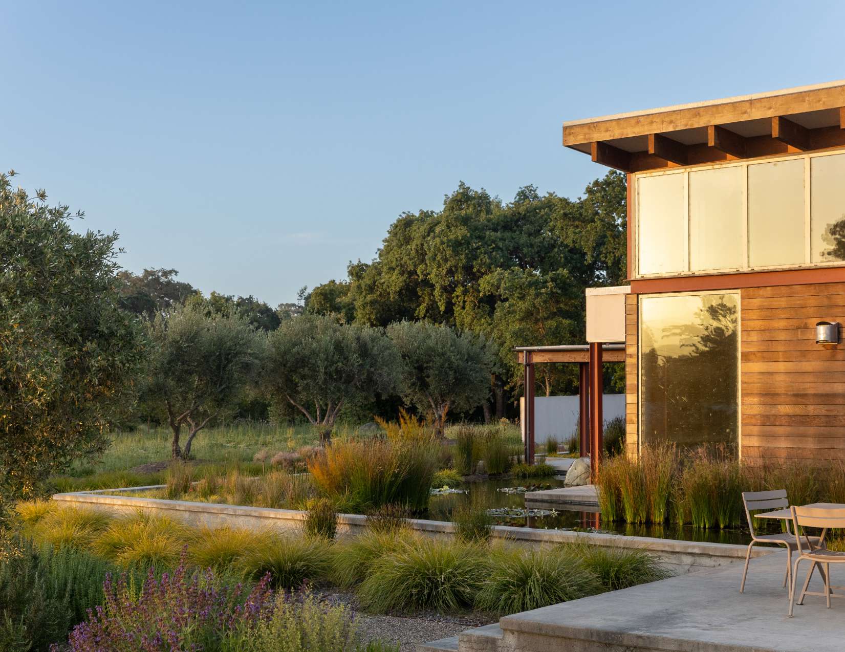 Flanking the entry walk and wrapping around two sides of this home outside the City of Sonoma was a contemporary concrete reflecting pool. Shallow, chlorinated and lined with Mexican beach pebbles, it felt more appropriate for an office park than for the country setting. We transformed the water feature into a living pond, re-using the concrete shell and three large existing boulders drilled for water recirculation, and existing plumbing and lighting where possible, to reduce waste to the landfill. We added overlapping rectilinear flow-through planters of fiberglass FRP panels at different water depths, filled with a special aquatic soil mix topped with gravel to keep the soil in place. Shallow aquatic planters and marginal planters support a diverse plant scape, reducing use of chemicals, creating habitat, and improving air quality, while creating a more welcoming entry to the home; a big impact for a relatively small investment.