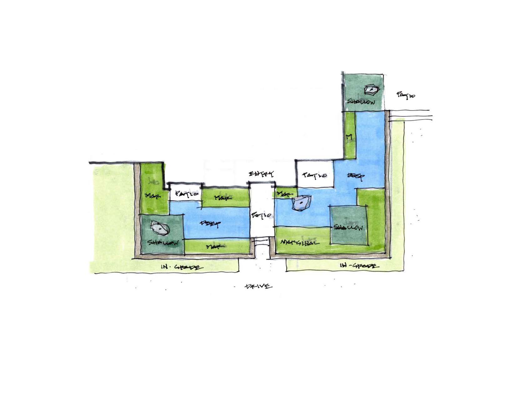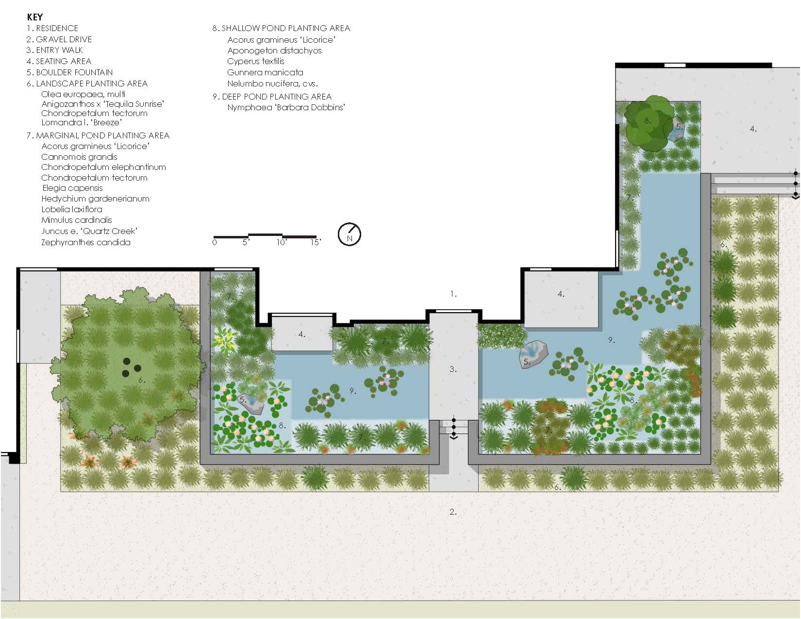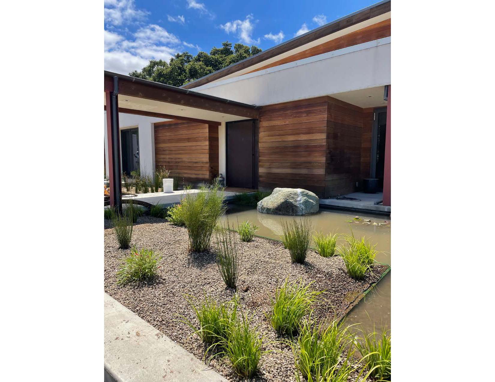 Flanking the entry walk and wrapping around two sides of the home was a contemporary concrete reflecting pool. Shallow, chlorinated and lined with Mexican beach pebbles, it felt a little sterile for the country setting. We pitched the idea of transforming the water feature into a living pond, and brought in a living pond specialist to rework the plumbing and filtration, and advise on planting media and depths.