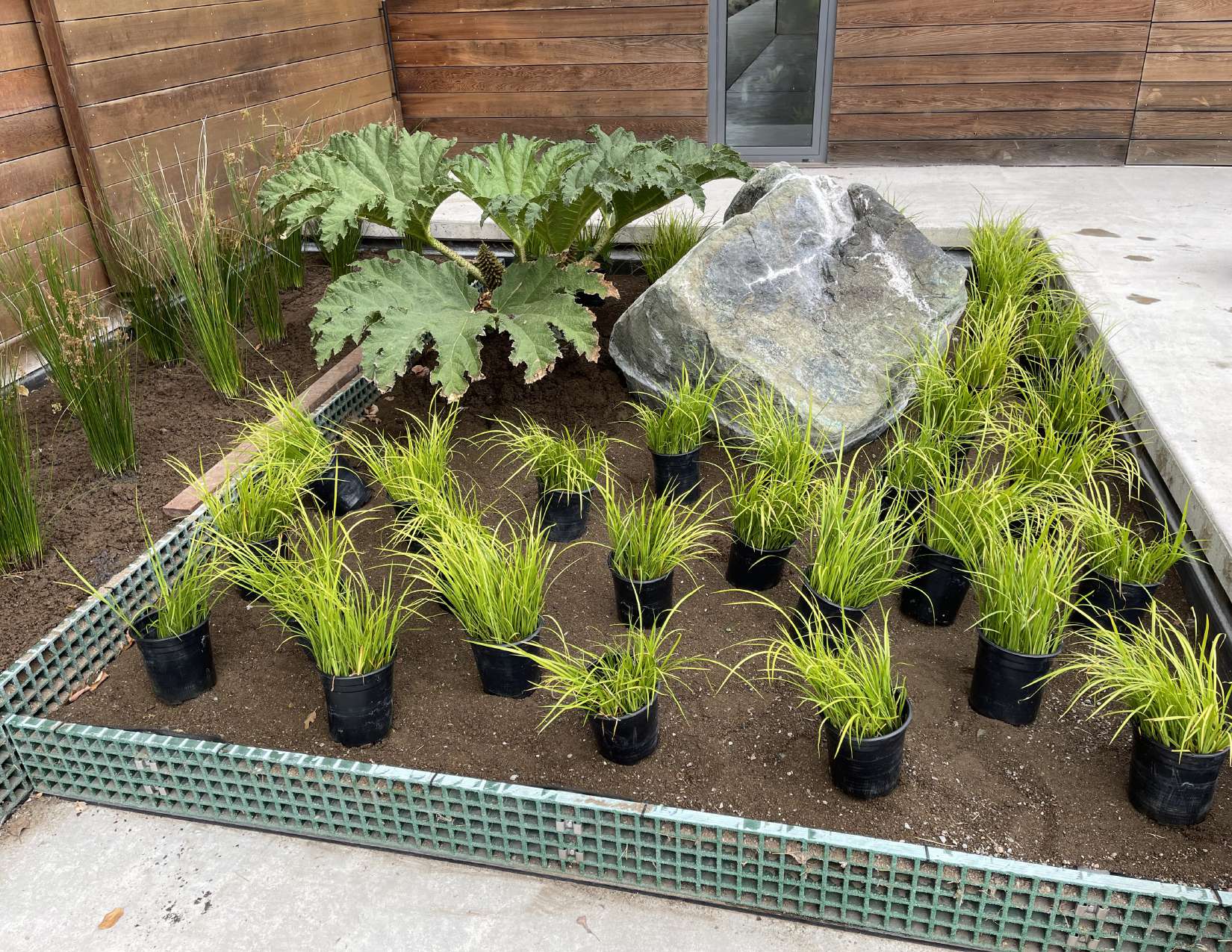 To reduce carbon footprint and reduce waste to the landfill, the existing concrete shell, lighting and much of the plumbing was reused. Three large existing boulders already drilled for water recirculation were joined by overlapping rectilinear flow-through planters of fiberglass FRP panels at different water depths, filled with a special aquatic soil mix topped with gravel to keep the soil in place. Shallow aquatic planters support Water Hawthorne, Sacred Lotus and Flat Rush; marginal planters for Kahili Ginger, Horsetail Restio, Mexican Lobelia, Cape Rush, Fairy Lily, and Soft Rush. One end of the feature is anchored by a Giant Gunnera, whose large, coarse leaves overarch the stiff boulder and contrast with the fine underplanting of Licorice Japanese Sweet Flag. In the deeper water, Water Lilies in special aquatic fabric planters spread out their horizontal pads in contrast to the verticality of the Cape Rush. Mosquitofish patrol the shadows, and as soon as it was filled and planted, the pond attracted dragonflies, bees, butterflies, frogs, and all kinds of birds. Outside the water feature at grade, a specimen Olive tree rests in a bed of Lomandra grasses. More Lomandra and Cape Rush wrap the concrete fountain shell in soft green foliage, while blurring the line between aquatic and terrestrial plantings. Overall, the transition from fountain to living pond reduces the use of chemicals, created habitat, and improves air quality, while creating a more welcoming entry to the home; a big impact for a relatively small investment.