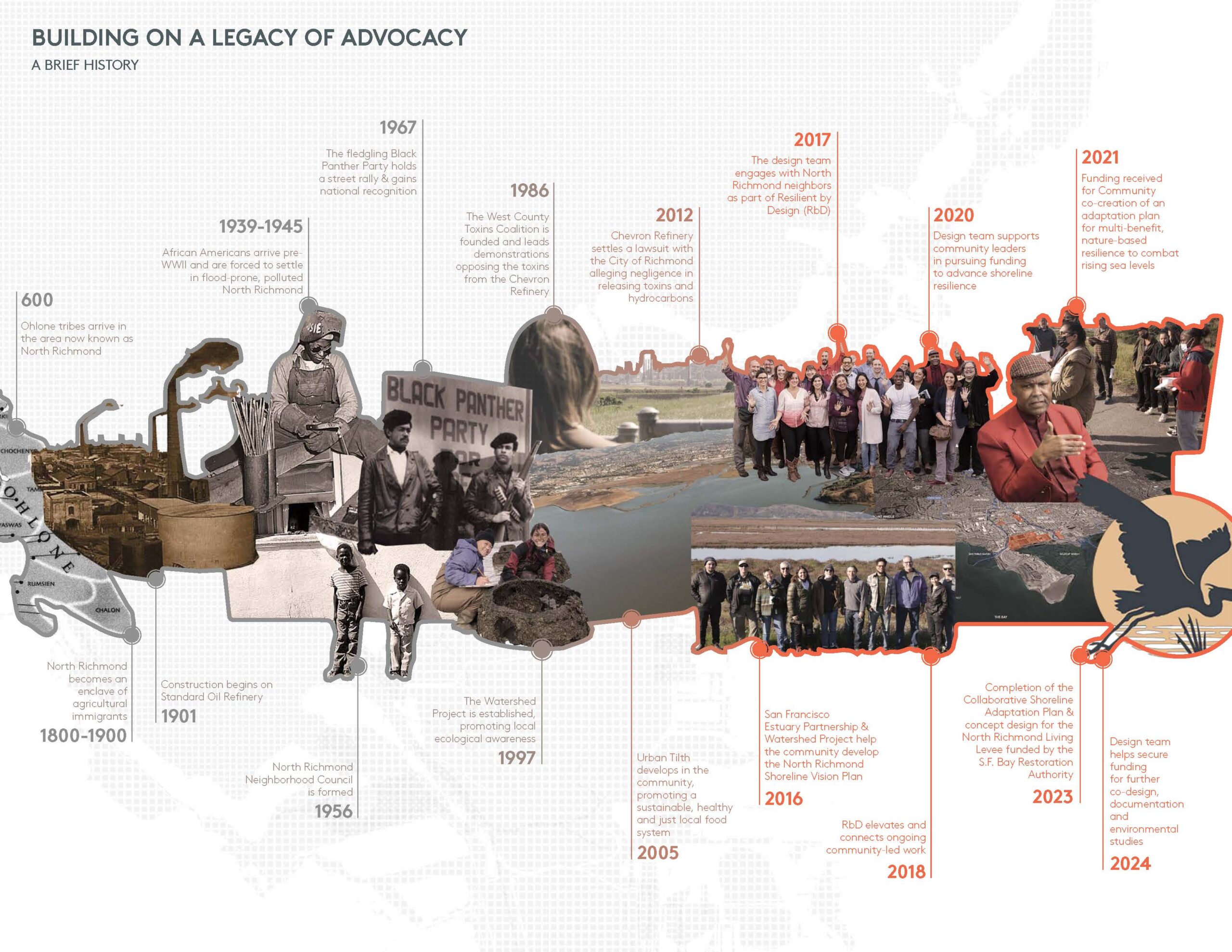 The North Richmond community has endured environmental injustice, disinvestment and racist development policies around their housing and infrastructure for five generations. During World War II, black families moved to the San Franisco Bay Area to support the ship-building effort and lived in housing supplied by the U.S. armed services. In the mid-1940s as those families left government housing, they were excluded from accessing housing in surrounding cities. North Richmond emerged as a neighborhood, developed in an ad hoc way predominantly by black families, with little support from public agencies. The area is low-lying, between two creeks and near a Bay tidal marsh. Nearby industrial uses (railroad, oil refineries) have compromised ecosystem and human health. One result of these unjust circumstances is a tradition of strong community leaders and collaborative groups working for positive change on toxicity issues, habitat health, flooding resilience, and housing rights.