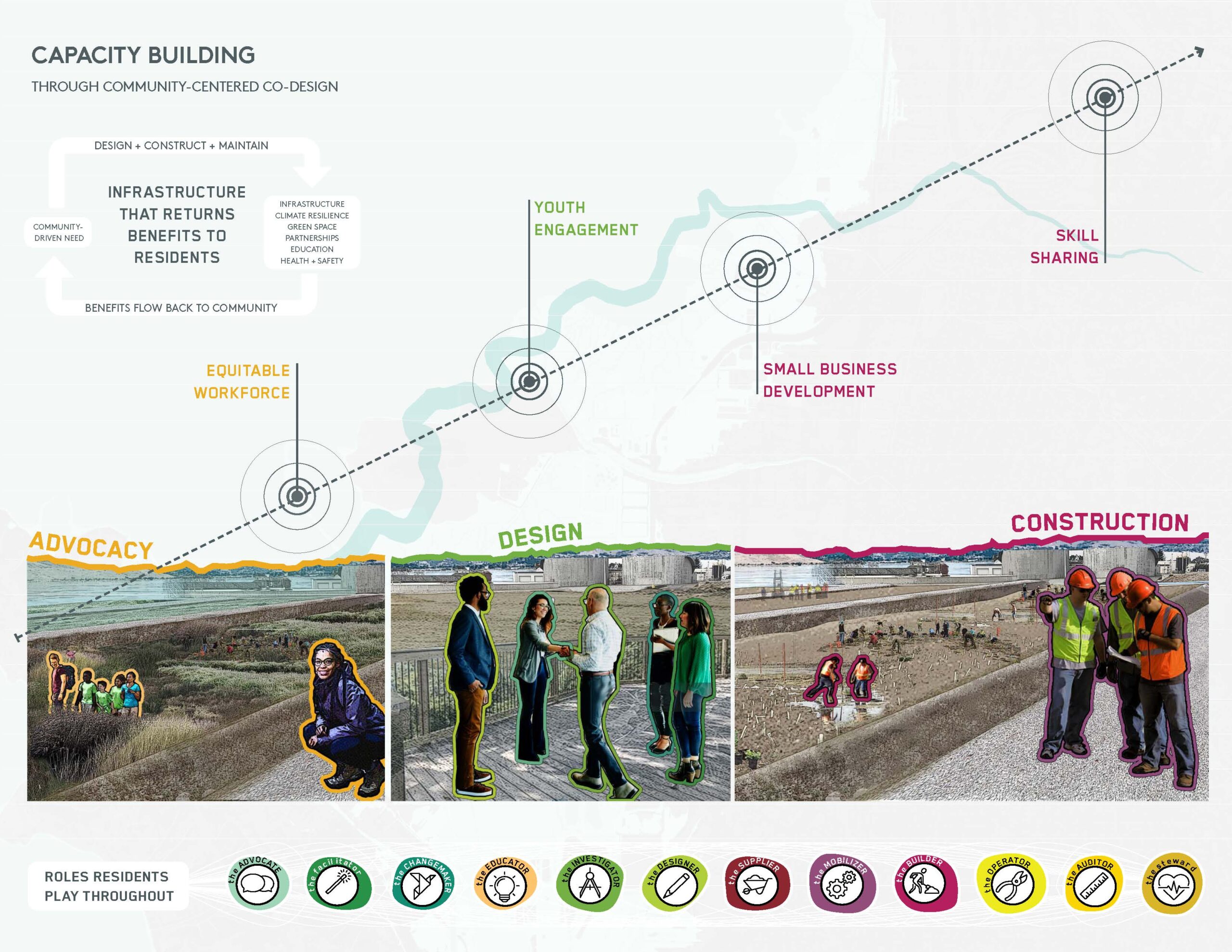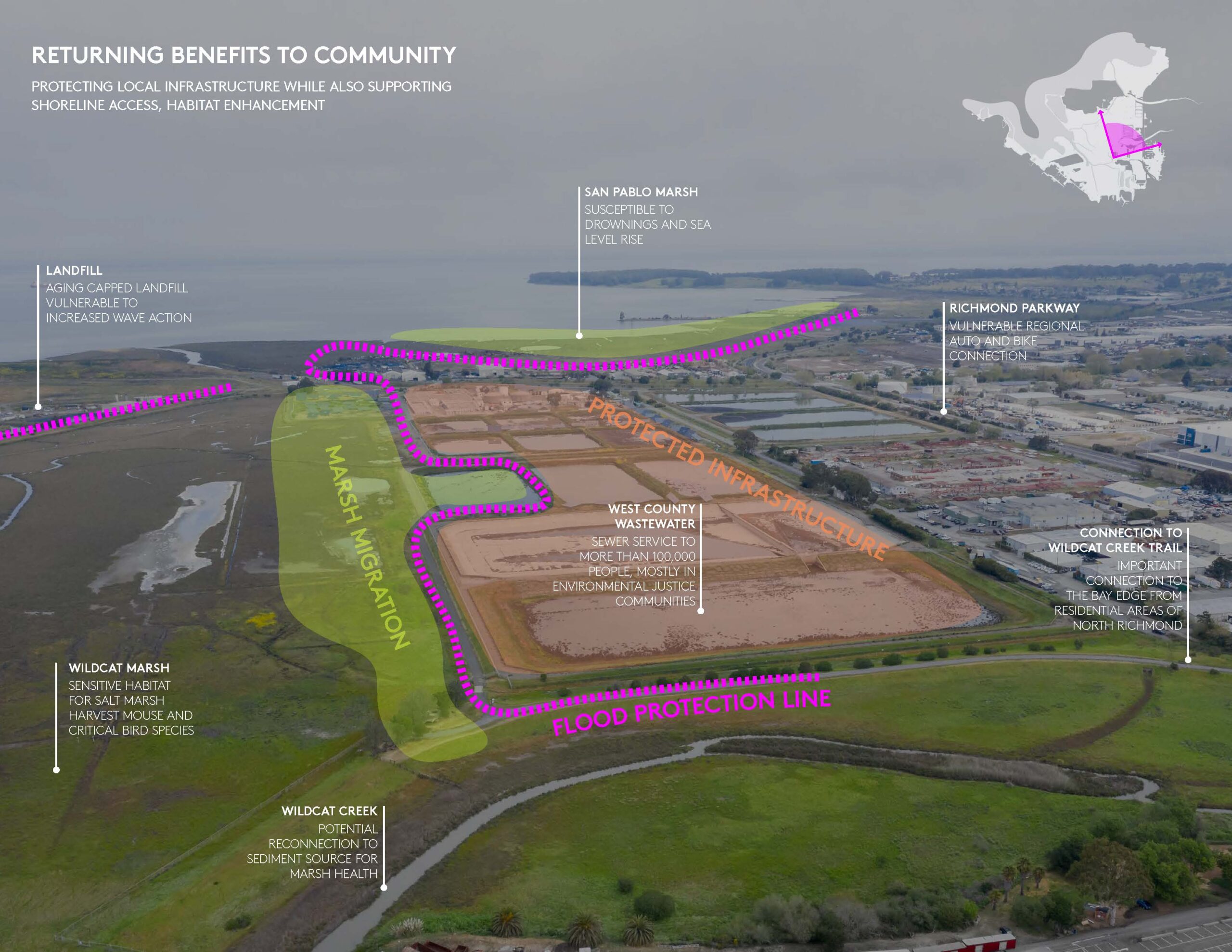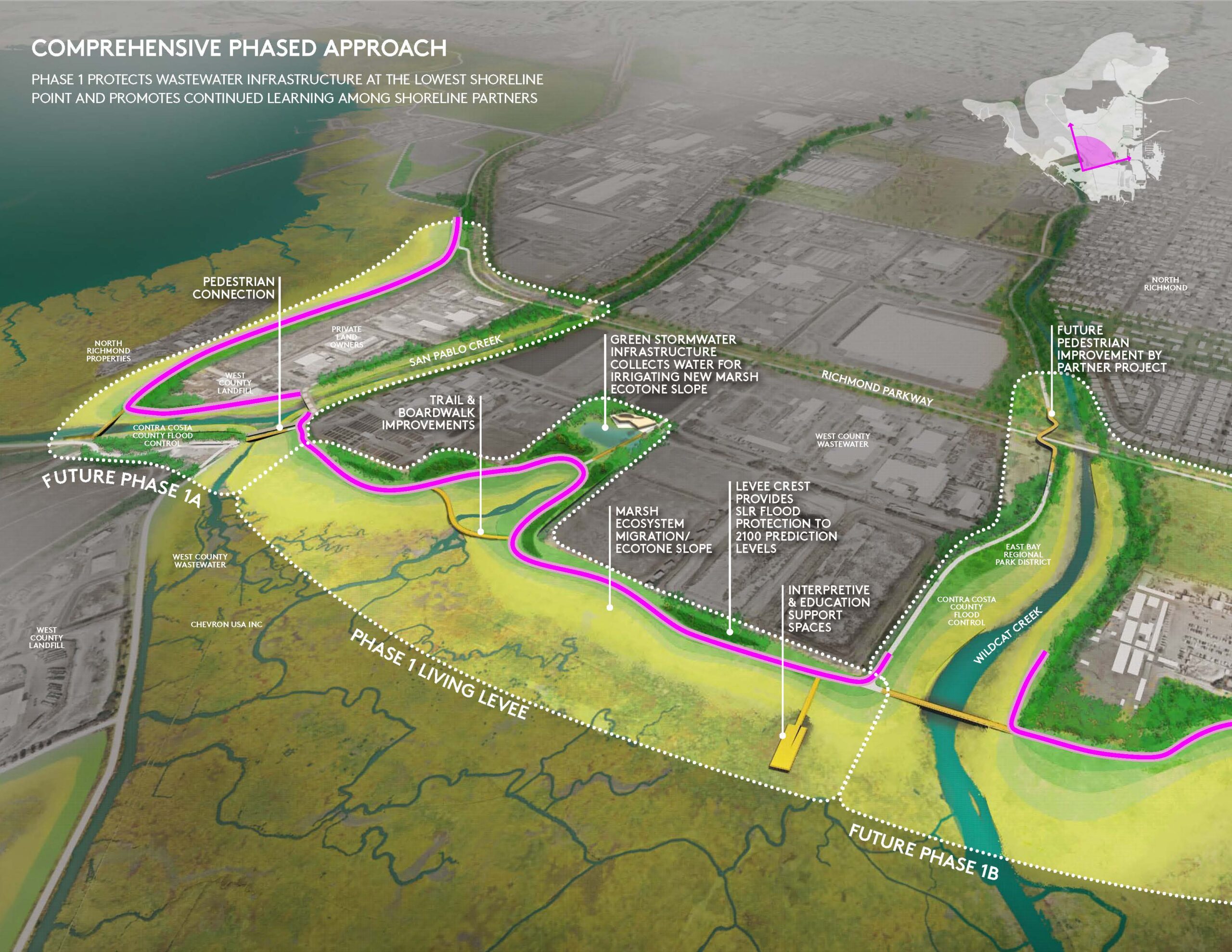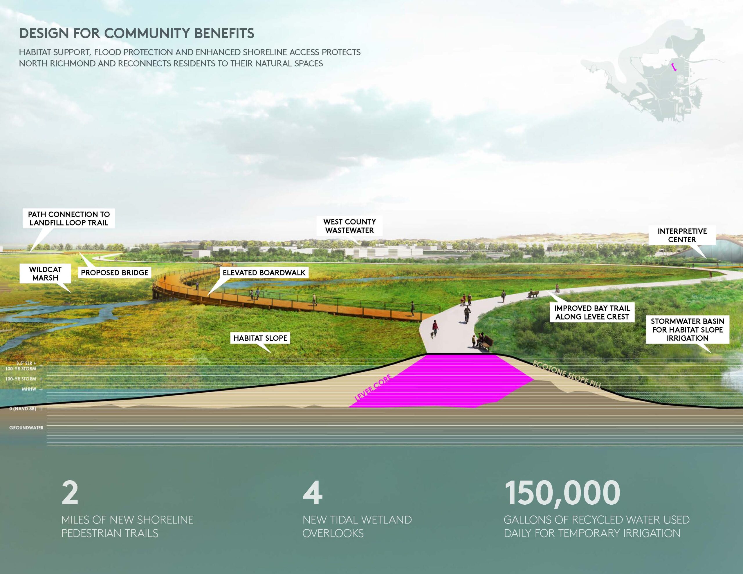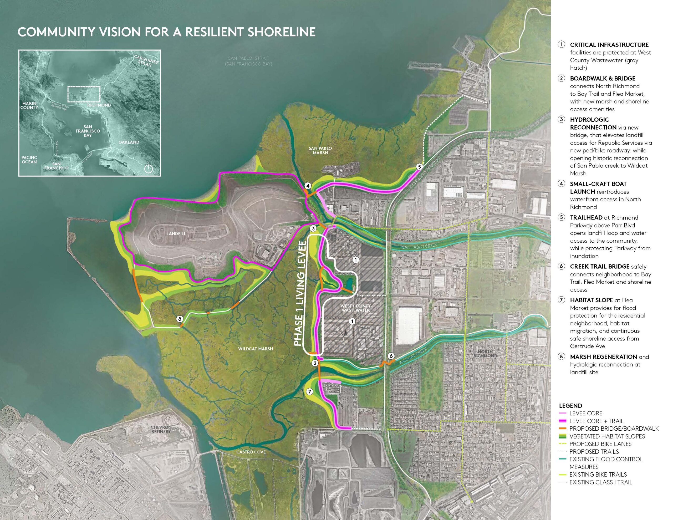 The plan is rooted physically in two parts. First, a multiple-benefit adaptation at Wildcat Marsh call the ‘North Richmond Living Levee.‘ This catalyst project consists of an ecotone slope and flood protection levee that protects the wastewater treatment facility and accommodates migration of the marsh as seas rise. This part of the scope and its design development drawings have been used for agency conversations about regulatory gaps that make this type of multi-benefit project complicated to approve. This Phase 1 “Living Levee” also supports Bay Trail improvements and restores seven acres of tidal marsh. The collaborative, community-based approach has also attracted funders from both regional and federal sources to move towards construction implementation.