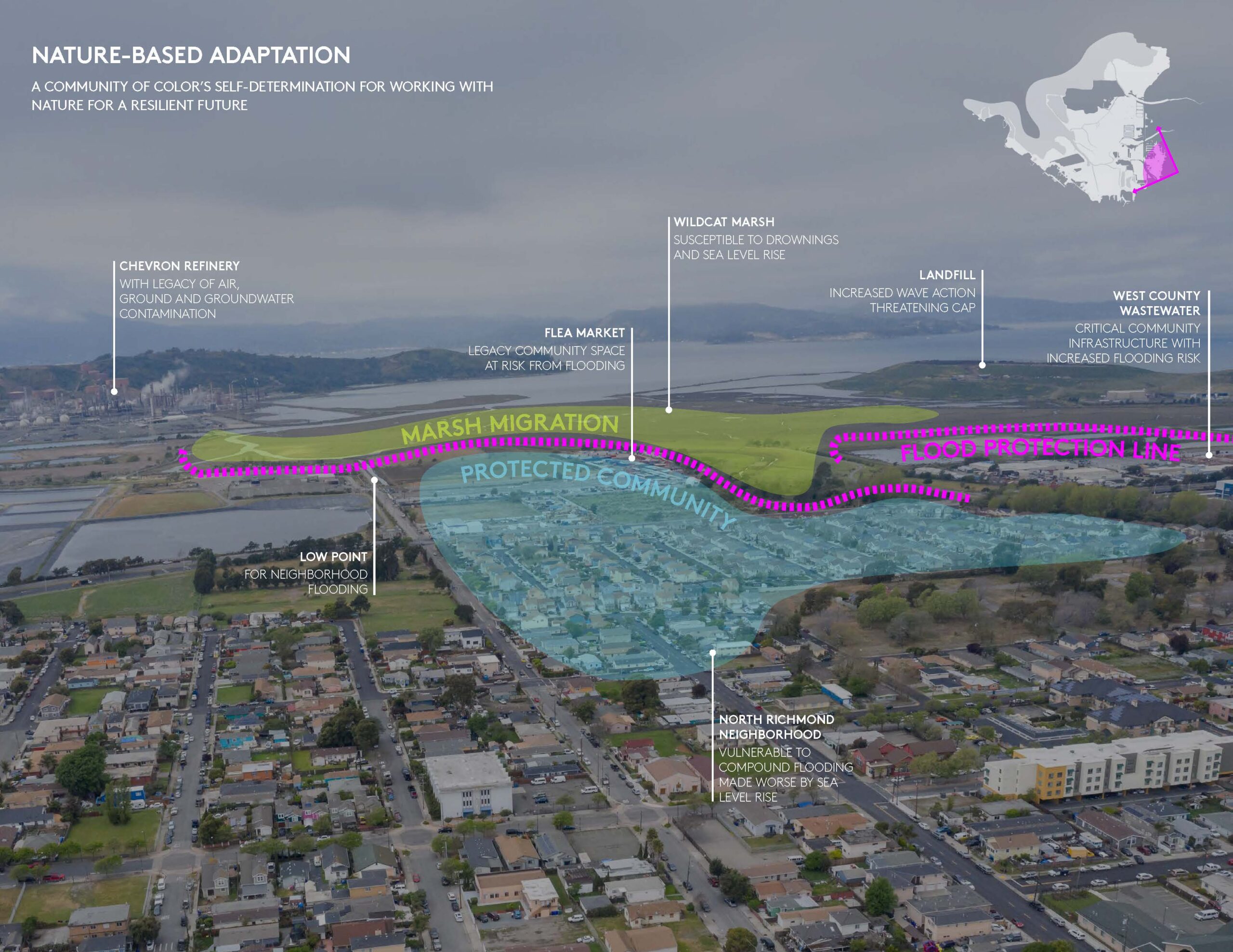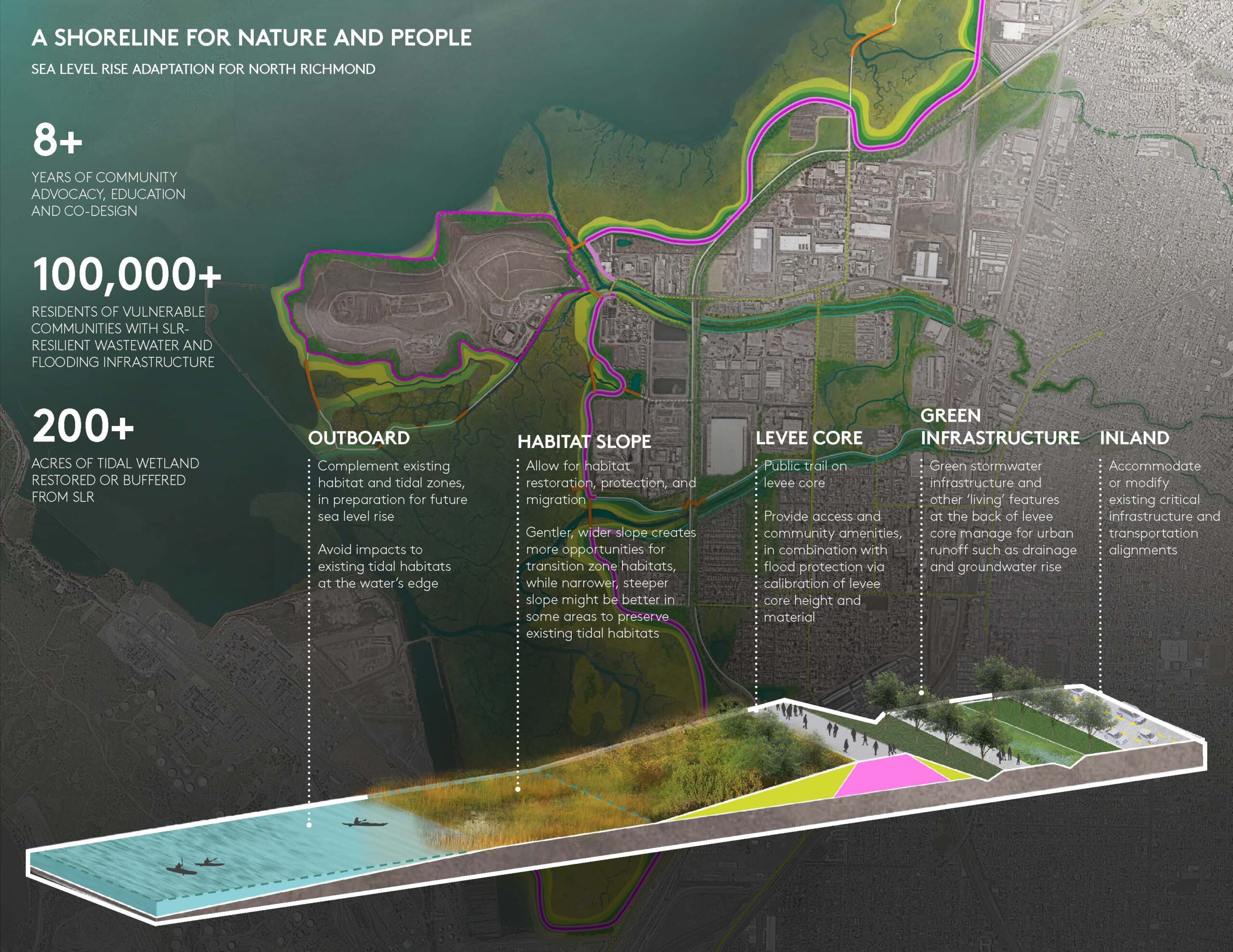 The North Richmond Collaborative Shoreline Adaptation Plan is exemplary in its use of sea-level rise (SLR) adaptation as a framework for prioritizing community-identified needs, supporting expansion of community environmental leadership while also supporting long-term health of shoreline habitats. The plan invests in nature-based SLR adaptation, intentionally creating direct community benefits to move toward justice in a place that has endured generations of disinvestment and racist environmental and development practices. The co-design process with the community engages residents in long-term adaptation visioning across generations, inspired by their own legacy of environmental advocacy. The plan includes nature-based SLR adaptation five miles of shoreline, and a Phase 1 project called the ‘North Richmond Living Levee’ to catalyze regulatory conversations, agency coordination and long-term governance modeling.