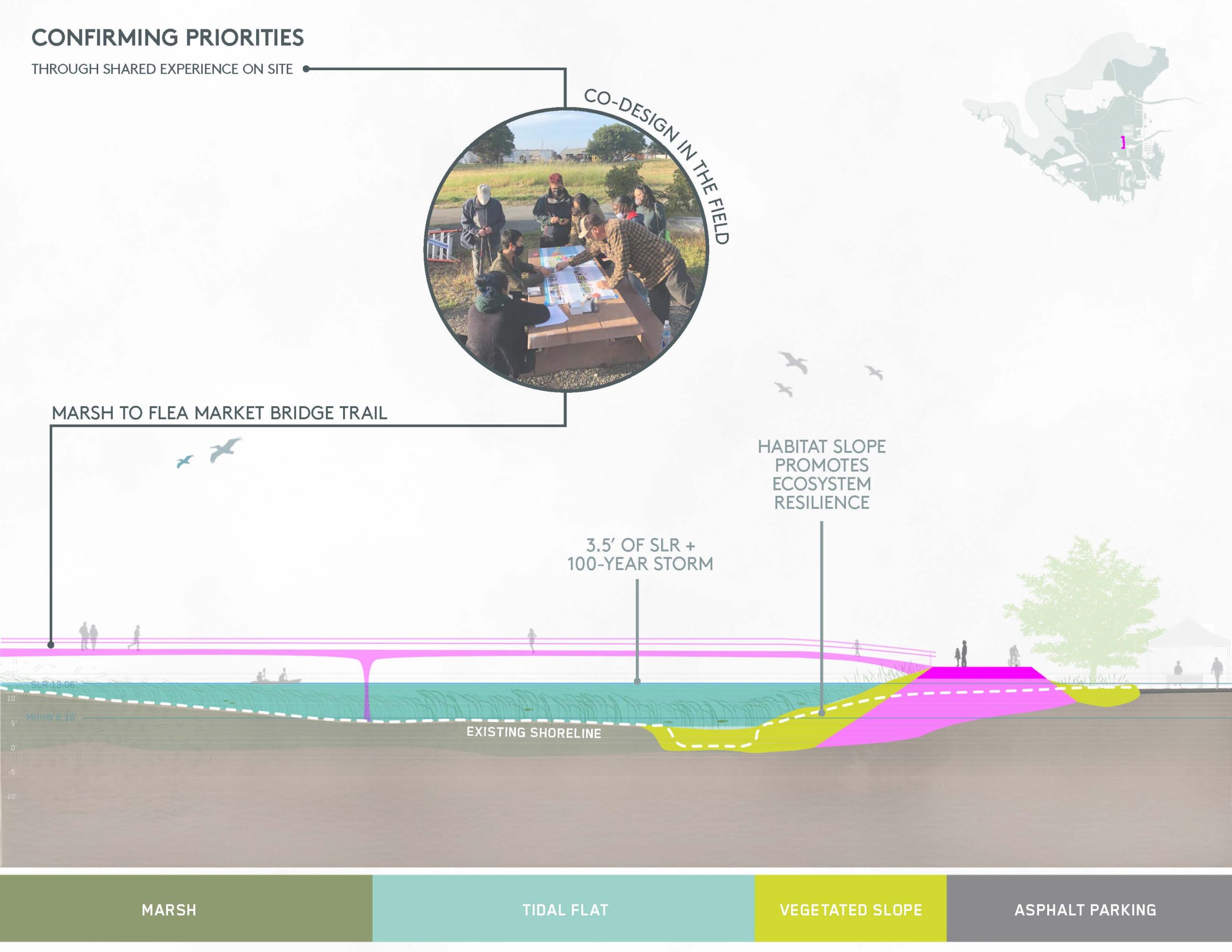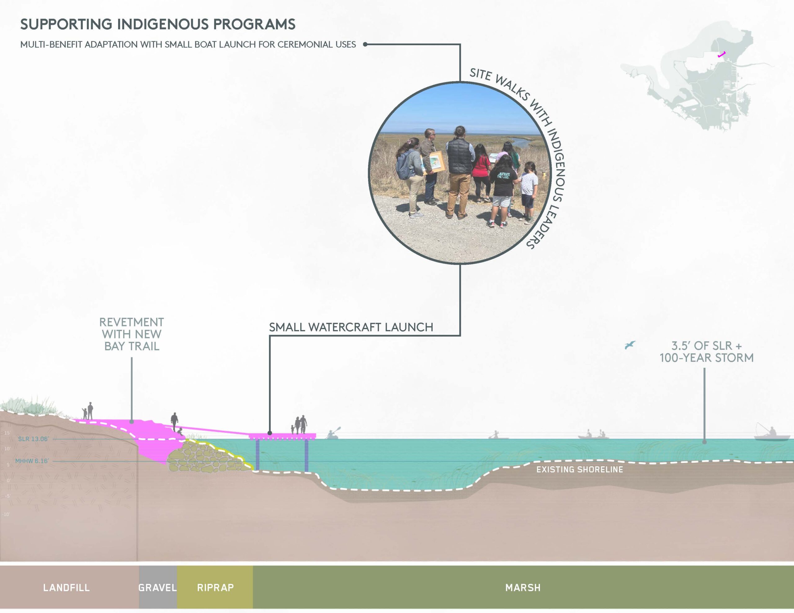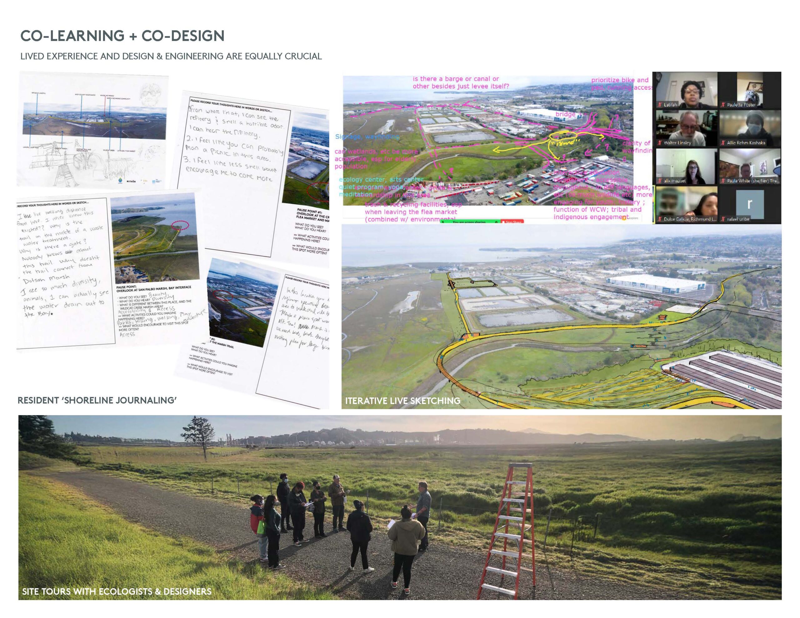 This project engages with and supports this ongoing community self-determination. In 2016 a coalition emerged to advocate for sea-level rise (SLR) adaptation that included residents, the local wastewater district, private landowners, volunteer designers, and advocacy groups. They obtained grants from a regional fund for community co-design of nature-based shoreline adaptation — the North Richmond Collaborative Shoreline Adaptation Plan (CSAP). The CSAP pursues human and ecosystem benefits simultaneously. The process connects community members with agency leaders; conducts knowledge exchange between tribal leaders from Confederated Villages of Lisjan, local residents and designers; centers future local workforce development; protects critical wastewater infrastructure and balances habitat migration space with public access.