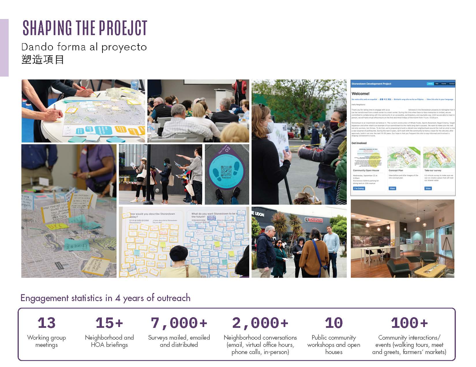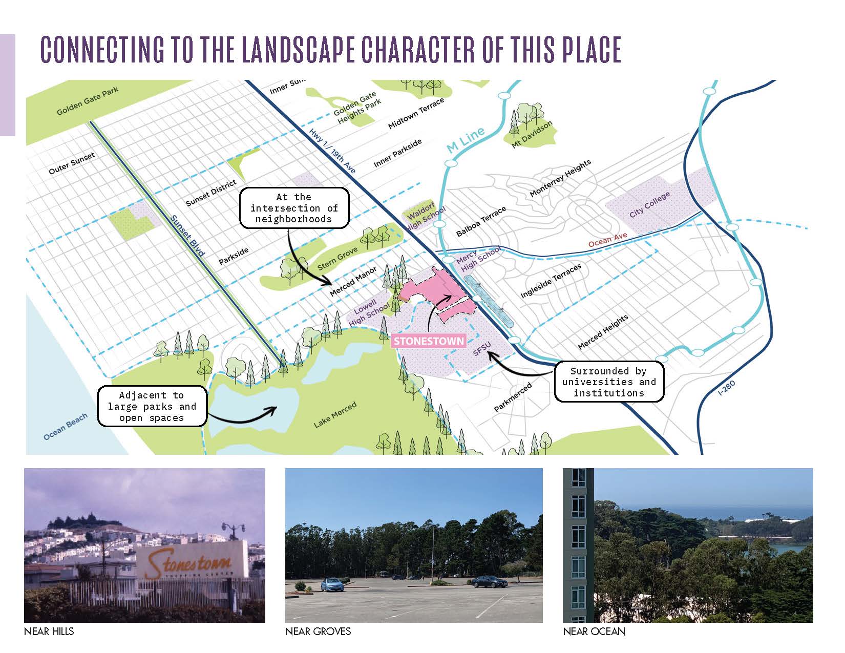 This redevelopment project is rooted in Stonestown’s history and local ecology as well as a robust community engagement process—throughout the four-year planning process, the team hosted virtual and outdoor workshops (during Covid), presentations, and tours with digital and analog materials provided in the top three languages spoken in the neighborhood–English, Spanish, and Cantonese. The process involved 27 neighborhood organizations encompassing diverse ethnicities, age groups, and income levels.