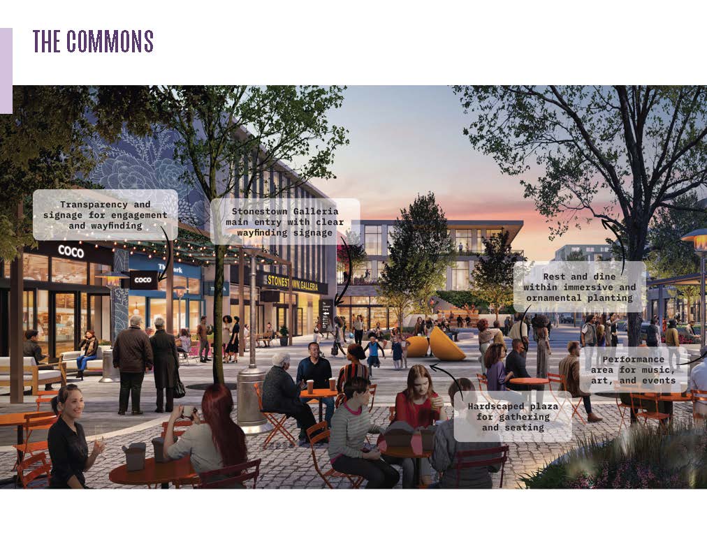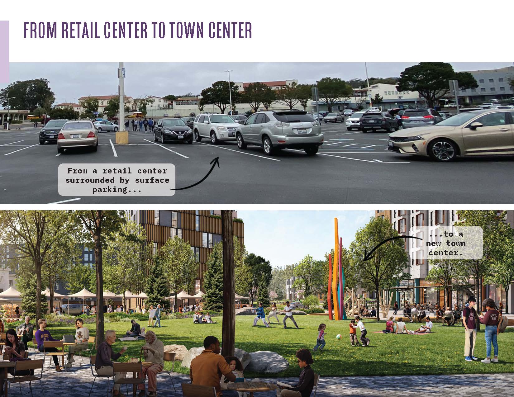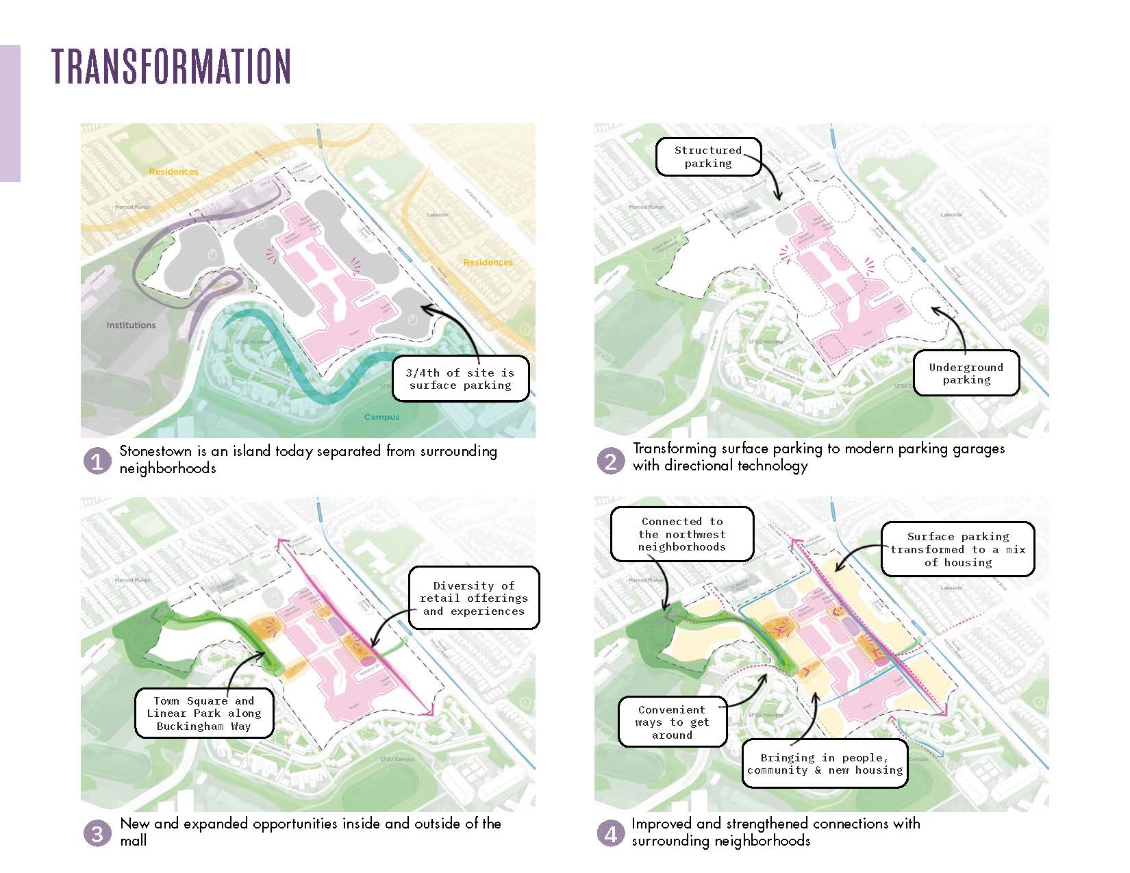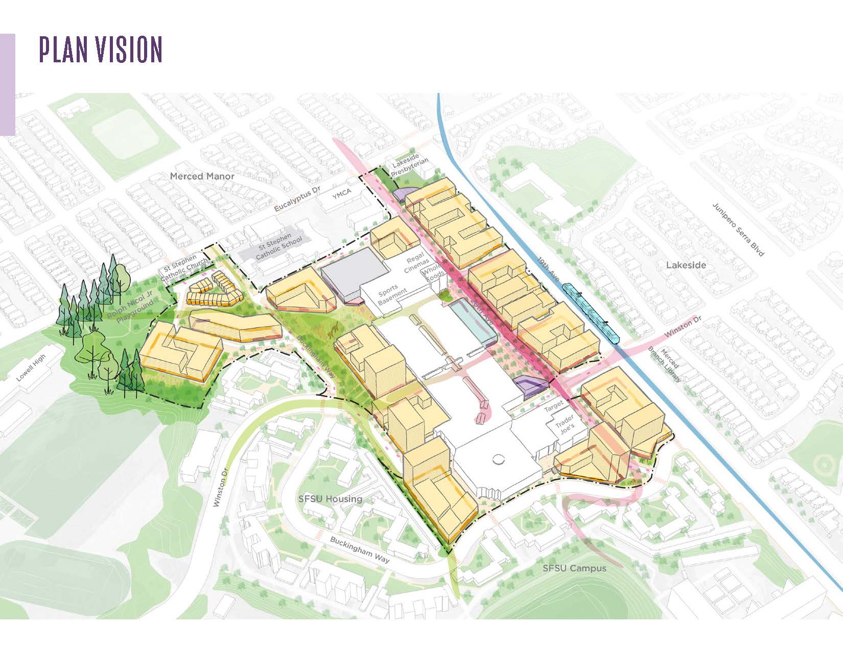 Stonestown Galleria in western San Francisco has long been a beloved retail destination, but it has also been an island surrounded by a sea of surface parking. Driven by human scaled experiences and greening, this redevelopment plan transforms 30 acres of underutilized parking lots into a mixed-use town center, evolving Stonestown into a thriving neighborhood. The plan increases density with 3,500 new homes, new retail and commercial space, and six acres of parks, plazas, and green spaces—together they create a walkable, transit-oriented district. A new main street, a lively town square for the existing farmers’ market, and a generous linear park redefine Stonestown as an important place to be in the community whether the mall is open or not. Thoughtfully crafted through community dialogue, this collaborative vision builds on mall legacy and grows an inward-facing retail hub into a connected and accessible town center for the future.