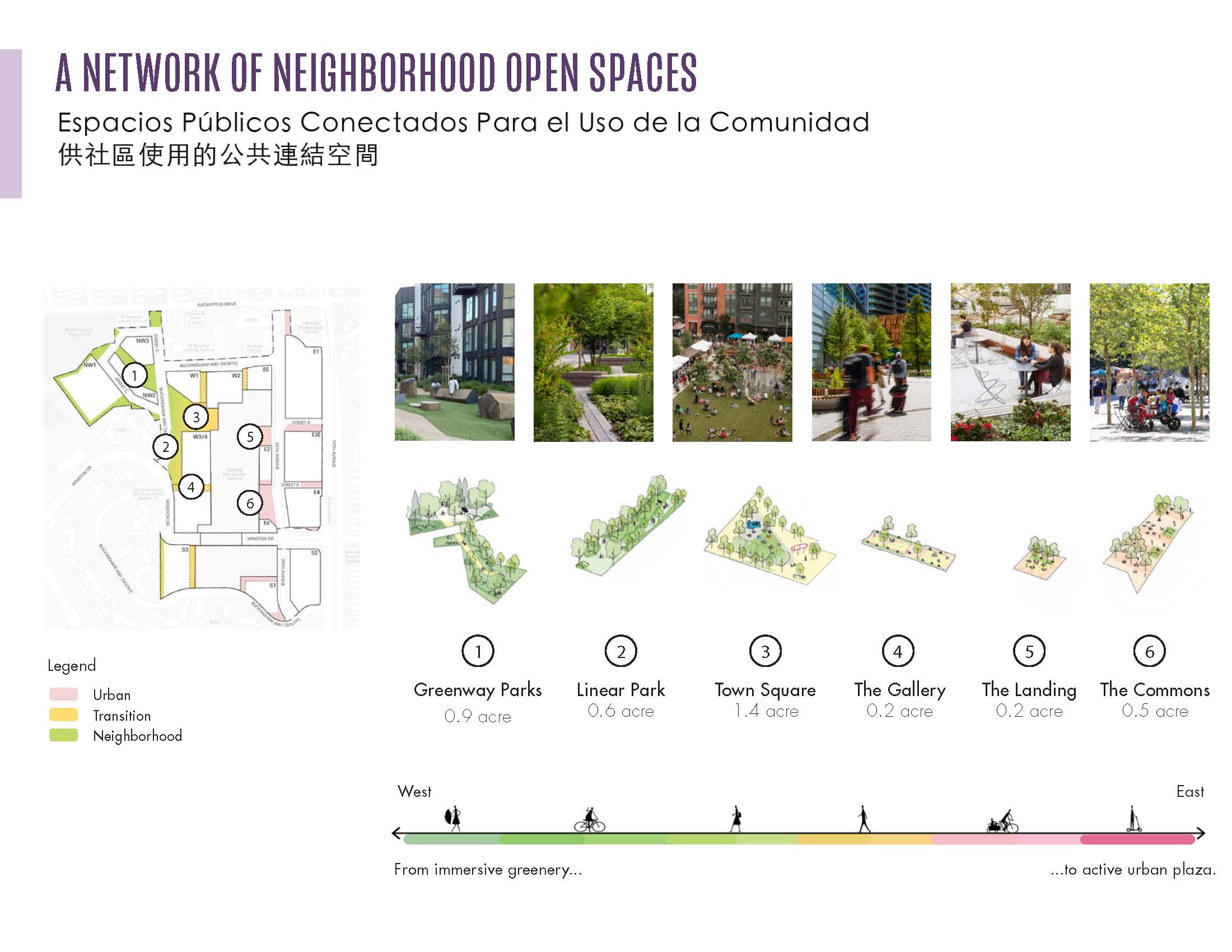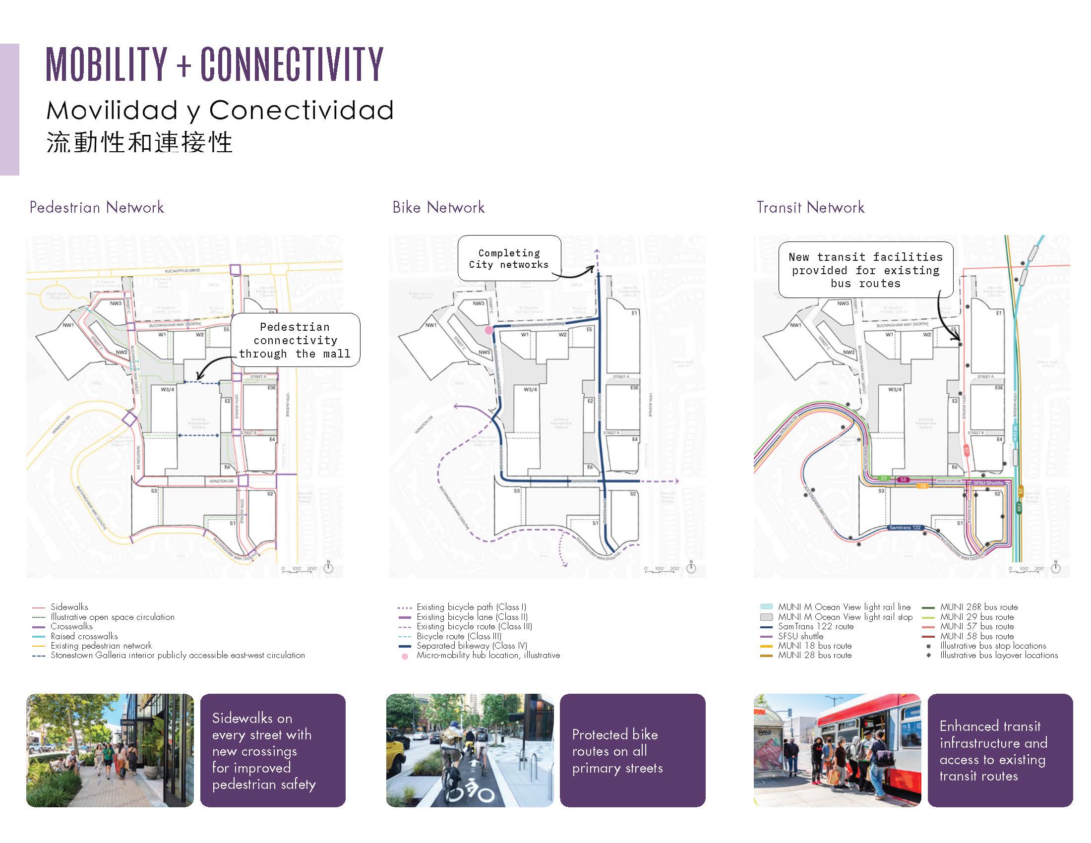 Building on the “city within a city” vision and community priorities, the open space design drivers include intuitive connections through the integration of plazas and parks at key mall and site arrivals, a seamless pedestrian and bike network that links the neighborhood to the site; immersive nature that transforms the paved parking lots into biodiverse, ecologically beneficial landscapes; and human-centered approaches that ensures accessibility and environmental comfort amidst the challenging topography and fluctuating climate of western San Francisco.