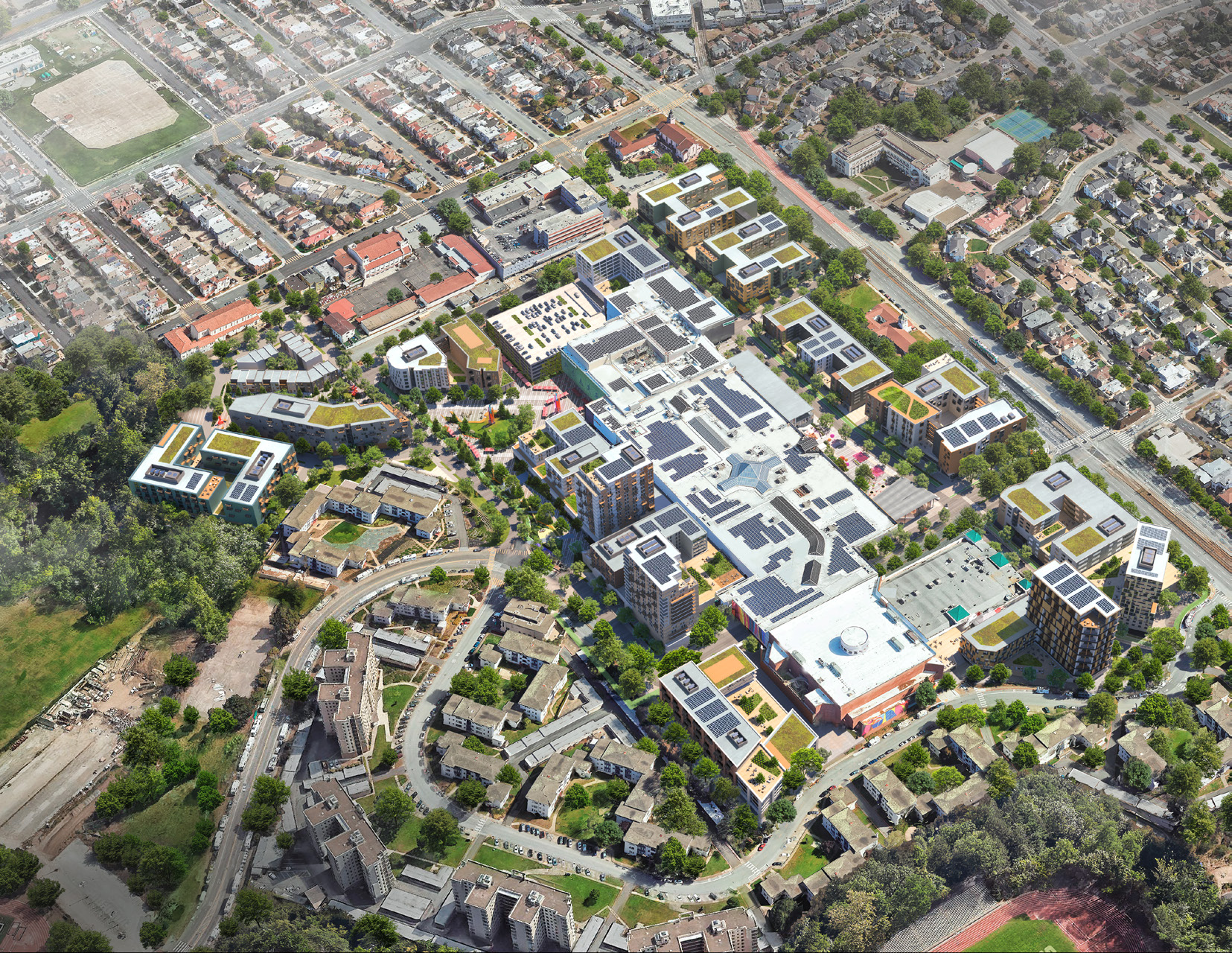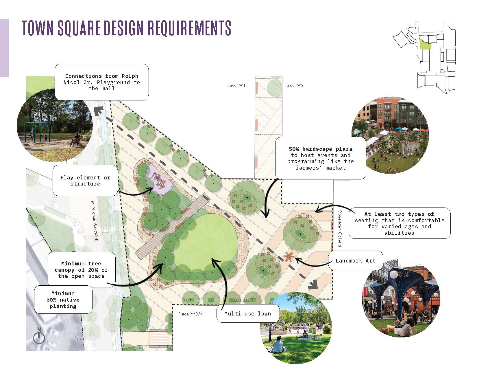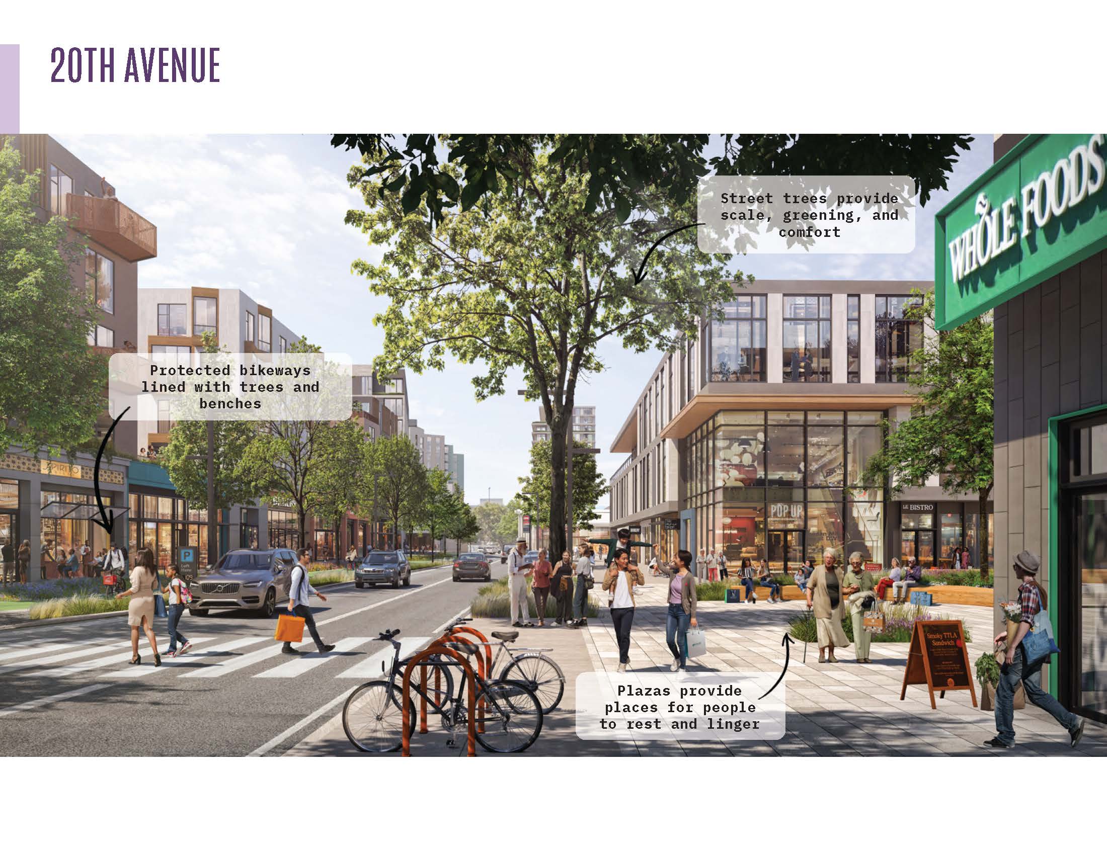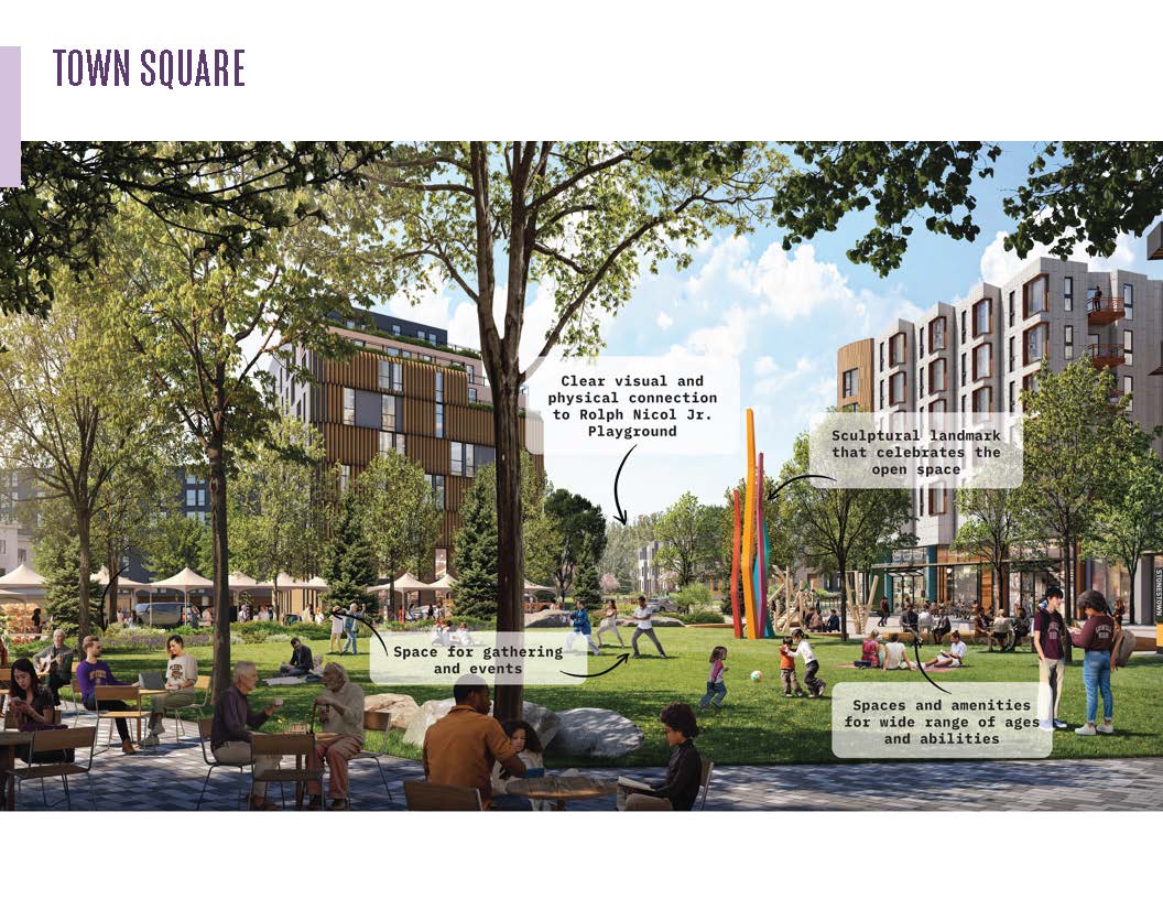 Rather than a single large park, the proposed network dispersed of parks, plazas, and mid-block passages are intentionally designed to balance the needs of delivering high-density housing, supporting a thriving mall, and providing intuitive circulation. Urban plazas along 20th Avenue feature retail and active spaces for seasonal displays and people-watching. To the west, more residential open spaces draw on a more nature-based character. The Town Square provides flexible areas of hardscape and softscape for events and hosting the existing beloved farmers’ market, while Linear Park and Greenway Parks offer wider planting areas and spaces for play and recreation, linking to the existing Rolph Nicol Jr. Playground.