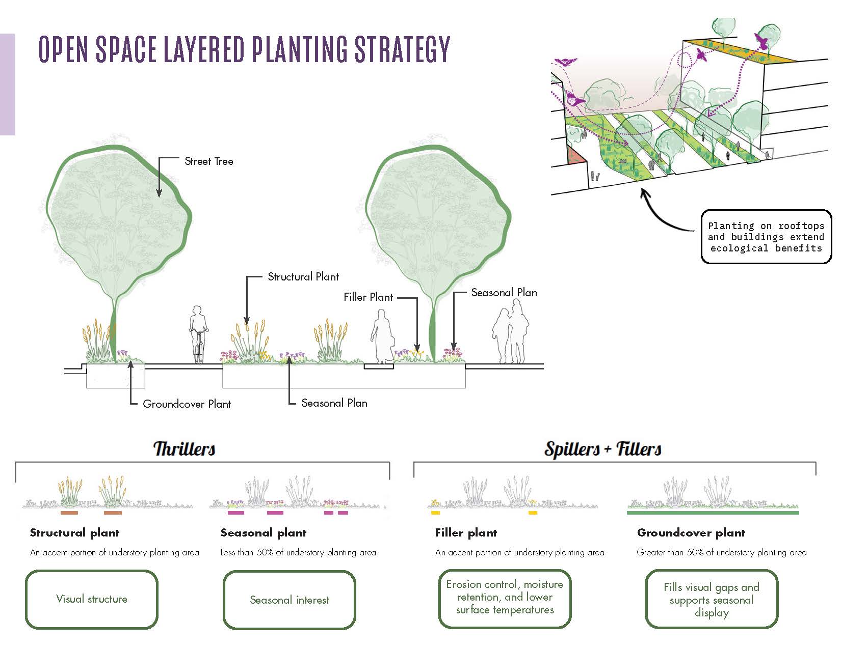 Recognizing that Stonestown is set within one of San Francisco’s more natural areas, it was important that planting play a significant role in the design—bringing ‘Big Green’ right up to the front door of the mall. The planting approach at Stonestown integrates ecological performance, durability, and aesthetics to connect the site to San Francisco’s natural ecologies while also honoring its retail character. The design requires planting design use a minimum of 50% California natives and 80% of species need to have habitat, forage, or pollinator value. Where feasible, open space and streetscape plantings are integrated to enhance the overall ecological function of the site. Structural soils are recommended in high-traffic hardscaped areas to support healthy tree growth, and plant selection aligns with SF Green Connection guidelines.