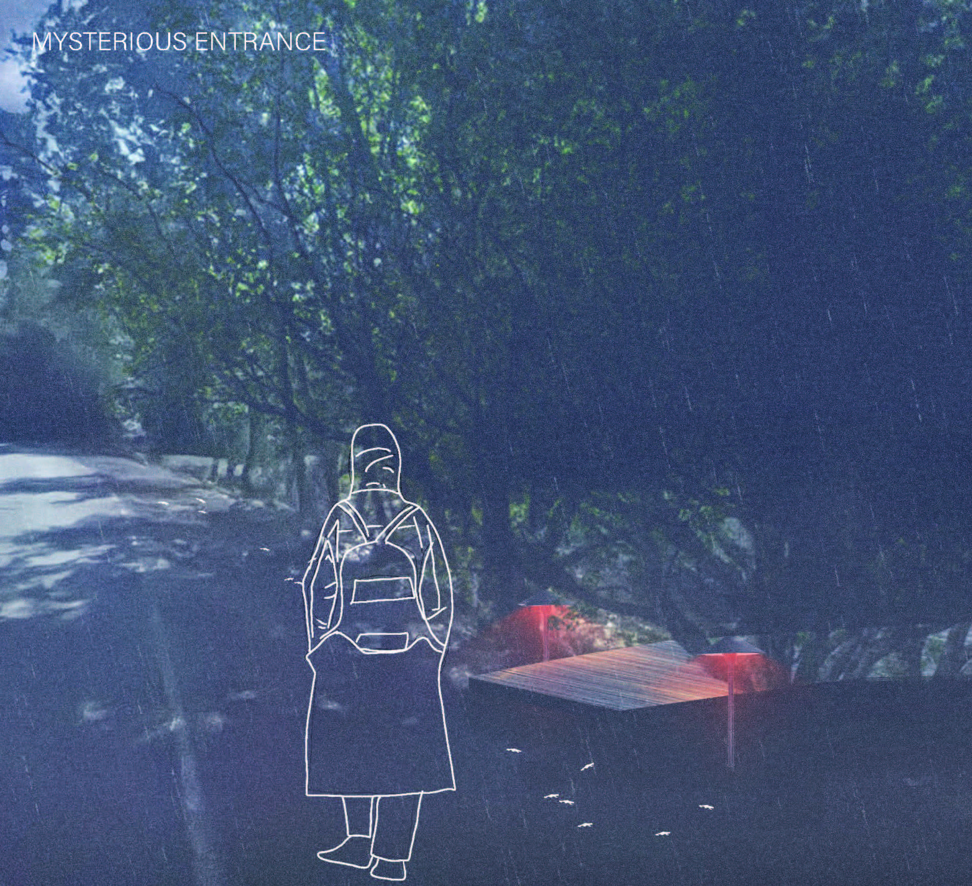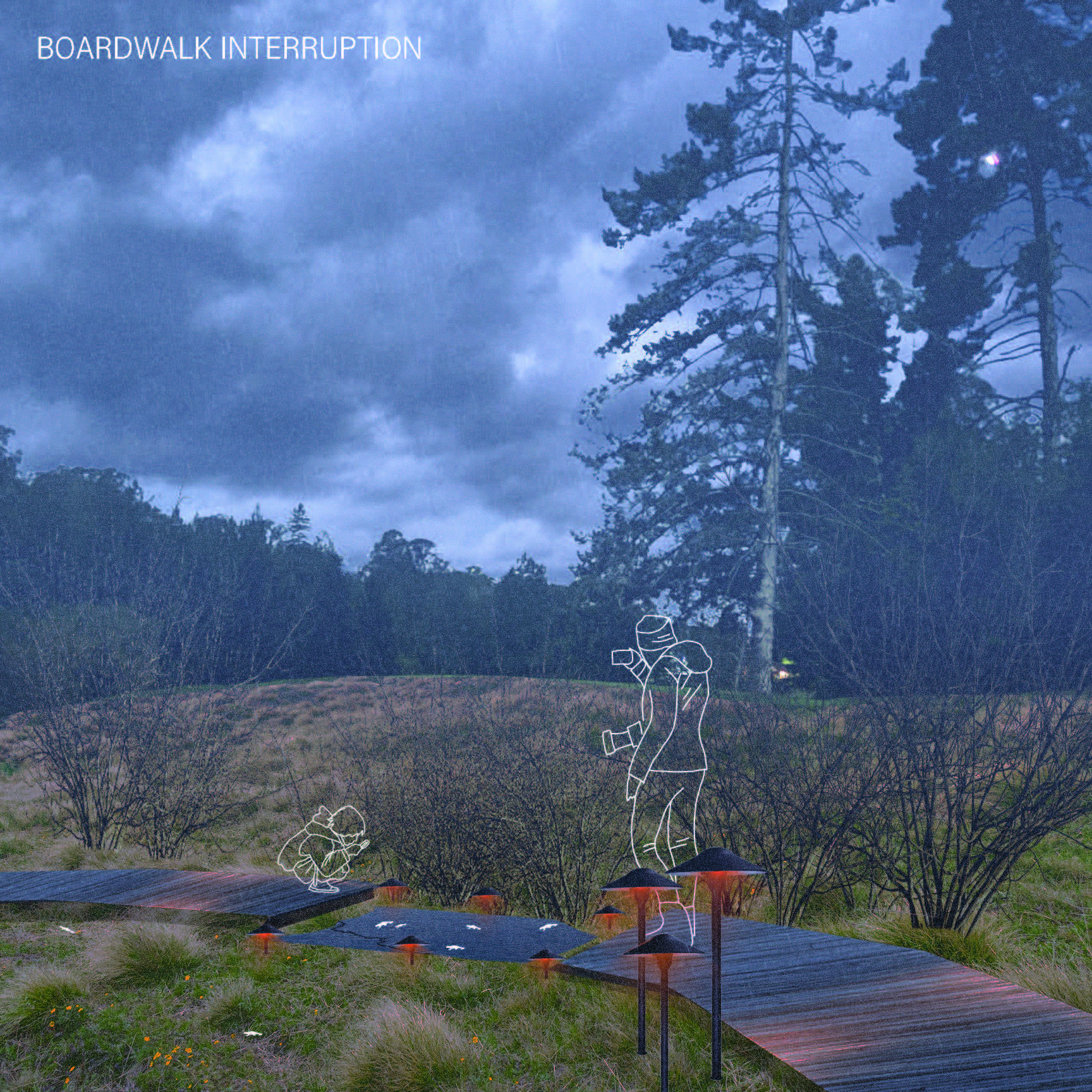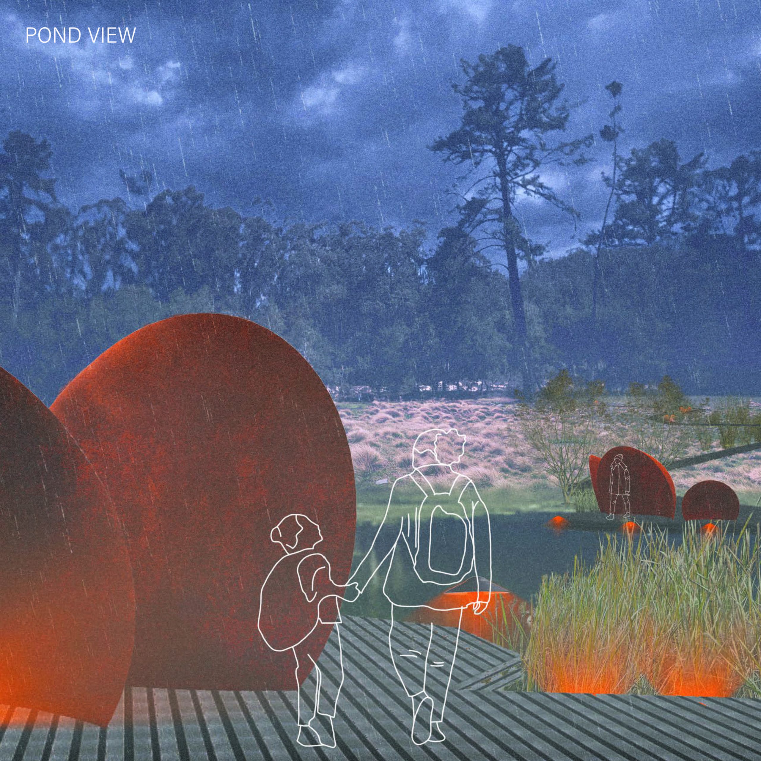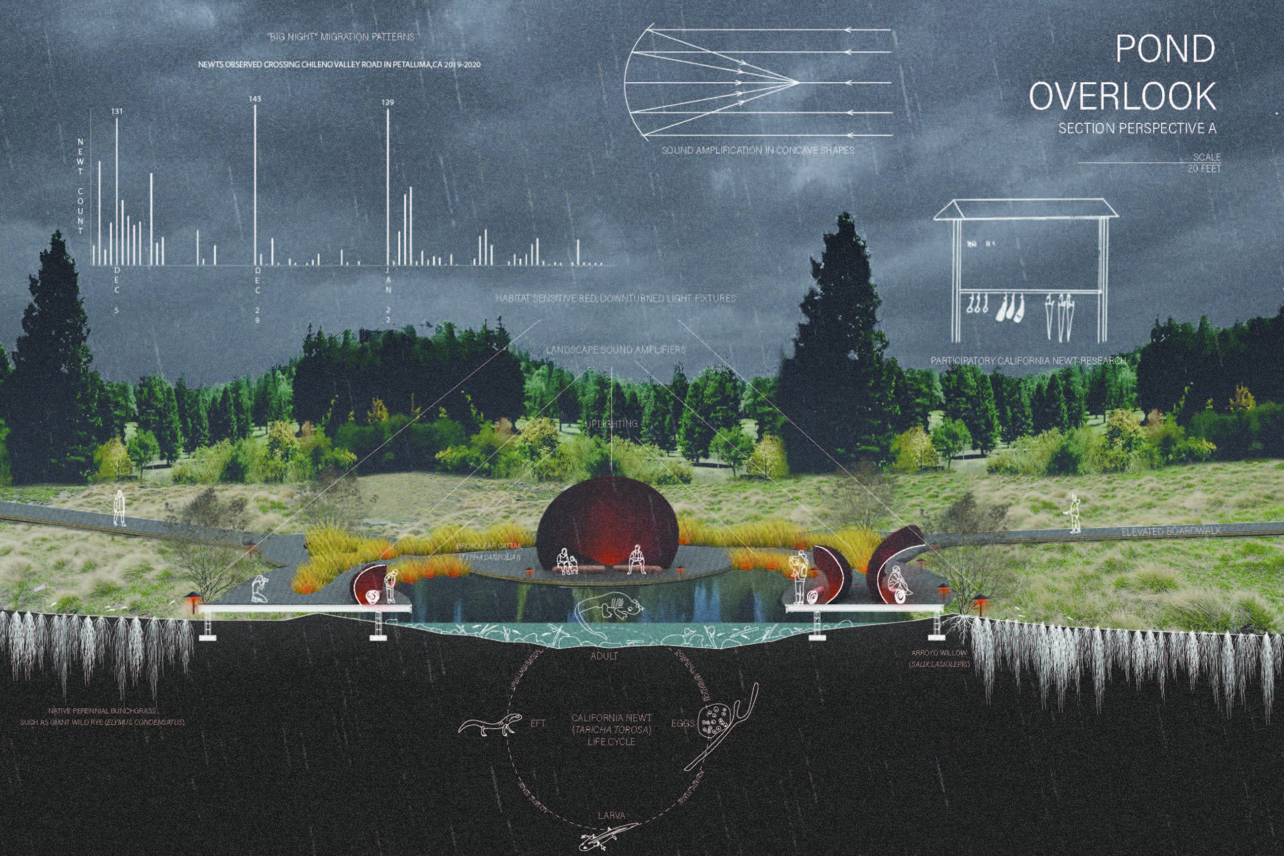 I wanted to design a special place that educates people about the importance of these amphibians to our headwaters, but would also serve as a reflective and sensory experience in all seasons. Additionally, I thought this would be a good place to engage the public in participatory newt research and counting–something that people are already engaging with via iNaturalist– in order to help with amphibian restoration efforts in the park.The design is about seeing but not touching the California Newt, as their skin is actually toxic! Beginning at the road, visitors are greeted with mysteriously lit entrances to a series of boardwalks. The lighting is red-colored and down-turned, which is the least disruptive frequency to the circadian rhythms of nocturnal animals. As visitors make their way down the elevated boardwalk (so as to allow the newts to pass under), they are occasionally interrupted by stone slabs placed at grade, intercepting drainage pathways on the site. My hypothesis is that a newt is likely to move along these drainages, as they need to move in places with moisture. These stone slabs are well-lit, and serve as a place for visitors to stop in hopes of catching a newt crossing over it, while being able to move around it or wait for it to pass. This is the closest one will get to the newt throughout this experience. The elevated boardwalk eventually makes its way to a platform at the side of a breeding pond, which is constructed with optimal grading for amphibian habitat. Visitors weave through willows and cattails alongside this pond, where newts will mate, lay their eggs, and the young efts will start their lives before migrating back to the uplands. On the platform is a series of sound structures at different scales–one big enough for a large group and some with room only for a small child–where one will not only be sheltered from the rain but also be immersed in the sound of rain hitting the roof. When not raining, these shelters act as sound amplifiers where one can hear bugs or birds across the landscape.