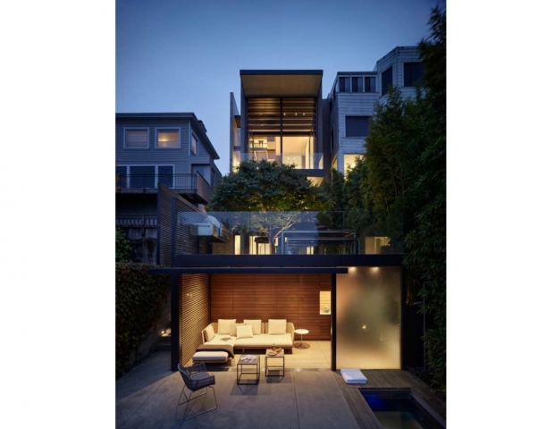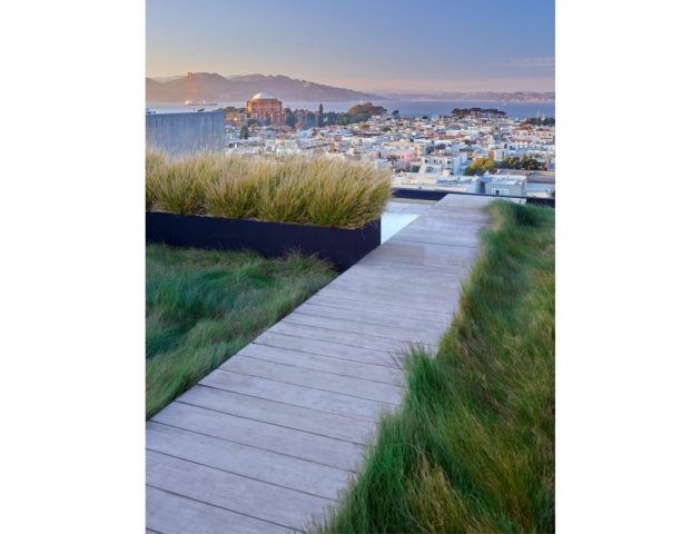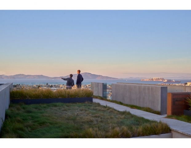 On a steep hillside in San Francisco, a terraced garden is seamlessly integrated with the architecture to create a series of intimate, flexible outdoor spaces. The design team worked with the client to accommodate a desire for flexible entertainment spaces by creating a series of stacked gardens as well as a green roof. Taking advantage of the steep down-sloping yard, the landscape architects carved into the hillside to create a lower, more secluded, and partially enclosed entertainment space with spa and fire feature. The cabana’s roof allows year-round use while also serving as the terrace and viewing platform to the outdoor living space above. Working closely with the architects to maintain a unified concept and the design goals, the team was able to cohesively blend interior and exterior, maximizing functionality for the client and capturing breathtaking views of the surrounding landscape at each level.