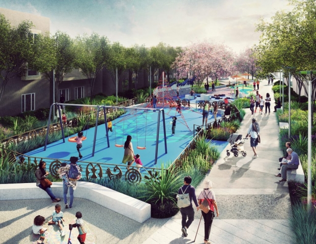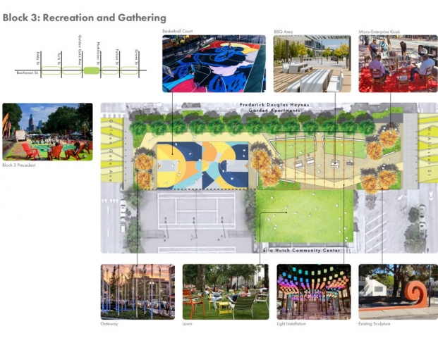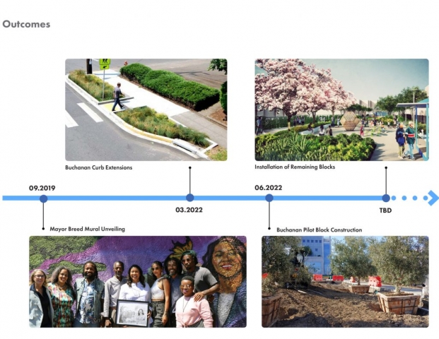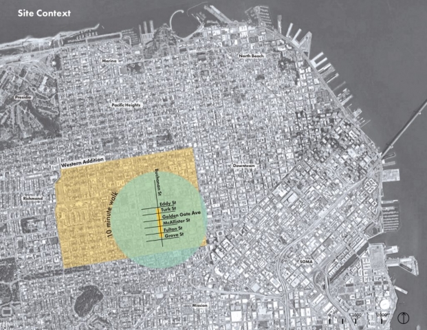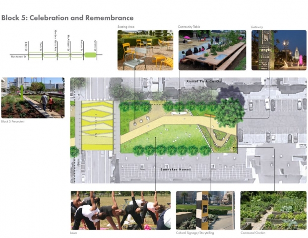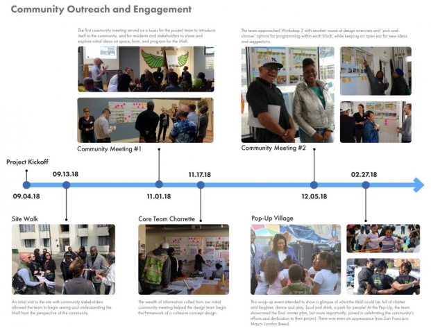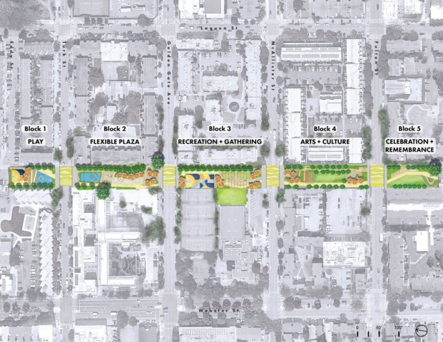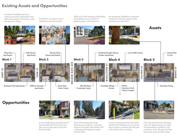 In 1975, following years of destructive “urban renewal” programs in San Francisco’s predominantly African American Western Addition neighborhood, five blocks of Buchanan Street were converted into a pedestrian boulevard, known today as the Buchanan Mall. The surrounding neighborhood suffered from the effects of the drug epidemic in the 1980s and 1990s, with increased crime and violence creating an atmosphere of fear in the Mall. This fear persisted until recently when a multi-disciplinary project team undertook a unique and ambitious public outreach effort involving the programming and design of the park by community members themselves.Together, the community and design team developed a capacity for reflective listening – synthesizing objectives and ideas into a coherent, compelling design. The outcome is a concept design that addresses the community’s primary concerns and connects the five park blocks through key design strategies: developing functional exterior spaces that promote community, connectivity, and socialization; providing accessible circulation and wayfinding; clarifying boundaries between public and private spaces; renewing the existing streetscape; and celebrating the neighborhood’s story and culture through visual, artistic displays.