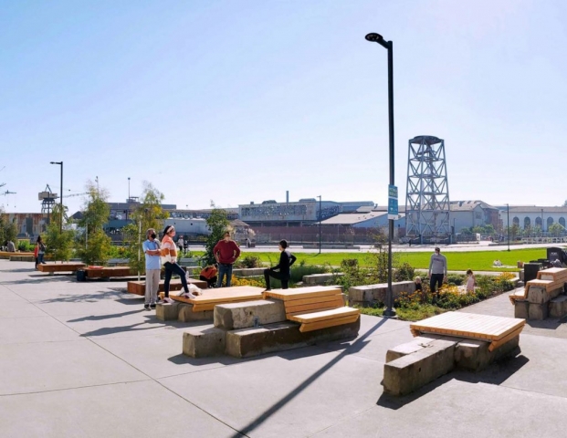 Urban design critic John King of the San Francisco Chronicle described Township Commons as “a startling act of urban reinvention that, with time, should pull people from across the city to an area that until now has been off the map”. The new park welcomes Oakland residents back to their waterfront with a bold and brave definition of a park. An adaptive re-use conceived with a radical imagination, the park is located within the footprint of the former 9th Avenue terminal and is inspired by the shipping and natural history of the site. Select building elements including remnant walls, retrofitted building trusses, and the imprint of loading dock geometry are preserved in the new design, but also are transformed to inspire and allow for new uses—including the creation of containers of coastal low water use plants. The project was immediately embraced by locals for recreational movement and water’s edge gathering. Its success as a first phase of the Brooklyn Basin development has created a strong public identity for the new neighborhood.