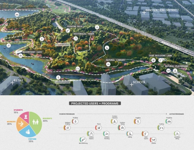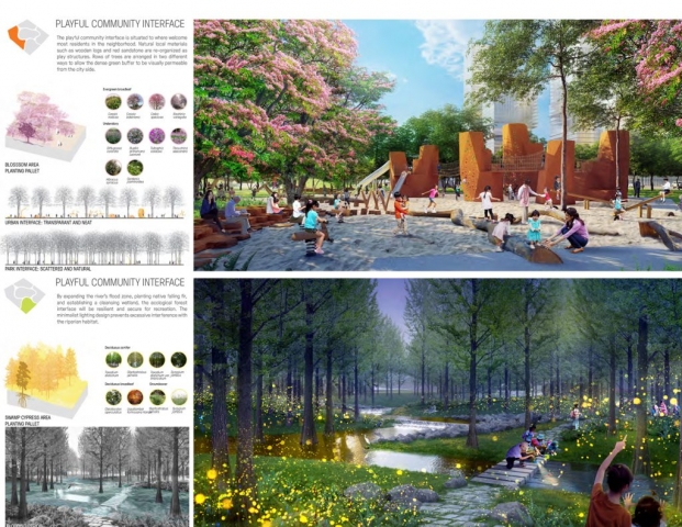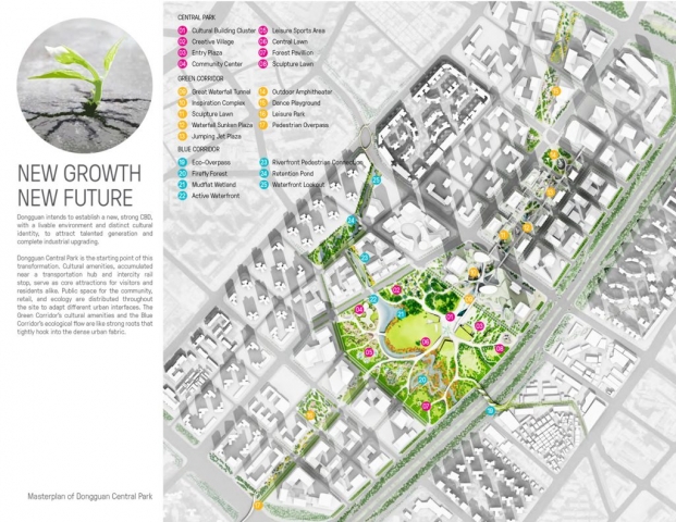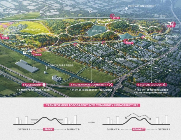 Dongguan, known as the “world’s factory,” is a typical decentralized manufacturing city located in China’a Guangdong-Hong Kong-Macao Greater Bay Area. The city intends to establish a new, strong CBD, with a livable environment and distinct cultural identity, to attract talented generation and complete industrial upgrading. Bolstering the area’s case for livability is the 32-hectare Dongguan Central Park, which was envisioned as the catalyst for the city’s new growth and evolution. Thorough soil, water, and planting strategies set up a healthy base for habitat establishment; creative use of local materials strengthens the sense of cultural identity; and multi-layer development take full advantage of the city’s last piece of undeveloped land, resulting in a one-stop, all-day social and recreational destination. Dongguan Central Park breaks the mold for many parks in China, which tend never to change once developed. Inspired by the hardy roots of the native banyan tree, the park is designed as the seed of a living system: sprouting out of the compacted urban ground, permeating into dense development, and evolving along with its surroundings.