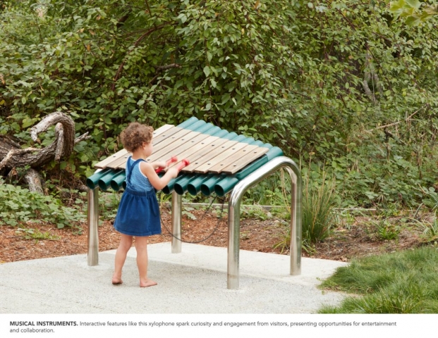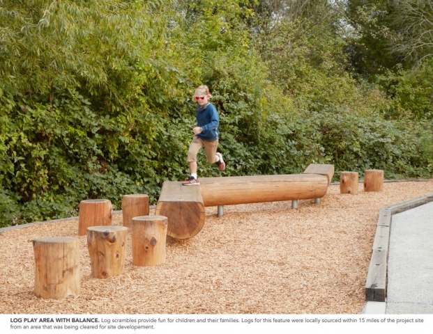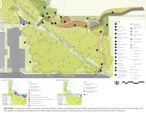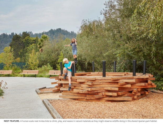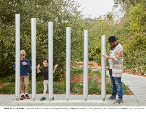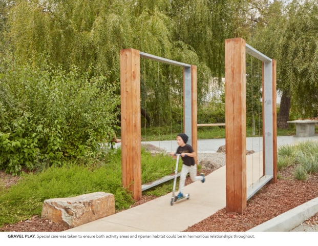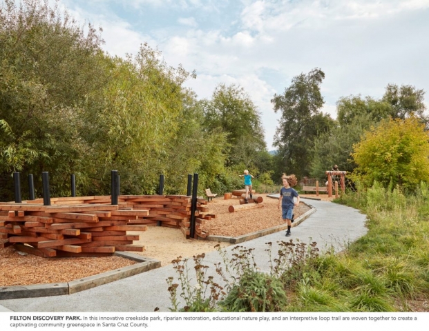 The Felton Library Discovery Park is an innovative outdoor space, designed as a sanctuary for pollinators, learning and play. Adjacent to a new creek-side library, the park cultivates a relationship between visitors and the natural world around them; weaving together creek restoration, educational nature play, and an interpretive loop trail to create a captivating community park in the old-growth redwood coasts of Santa Cruz County. The park drew upon community outreach events to create a conservation-forward design which extends the library’s spirit of wonder and discovery out into the landscape. The park includes the removal of a culvert, two new bridges which span the creek, riparian restoration, a pollinator habitat garden, a learning demonstration area with watershed exhibits, a tot gravel dig area, a stage and amphitheater with musical instruments, a nature play area with climbing and balance logs, a giant nest, a human sundial, a quiet gathering area, and cultural and environmental educational exhibits on the trail.