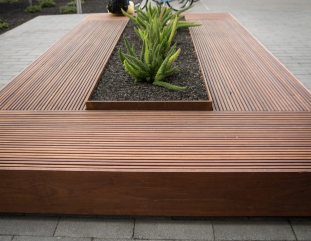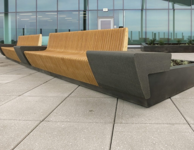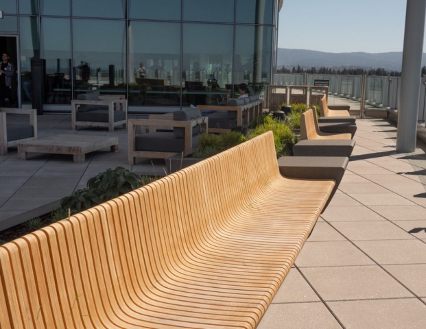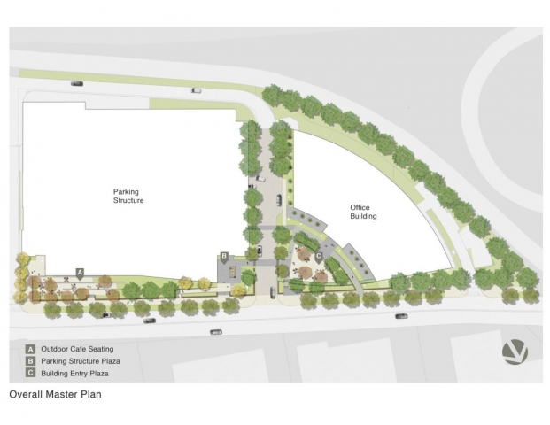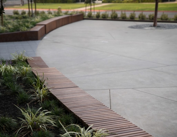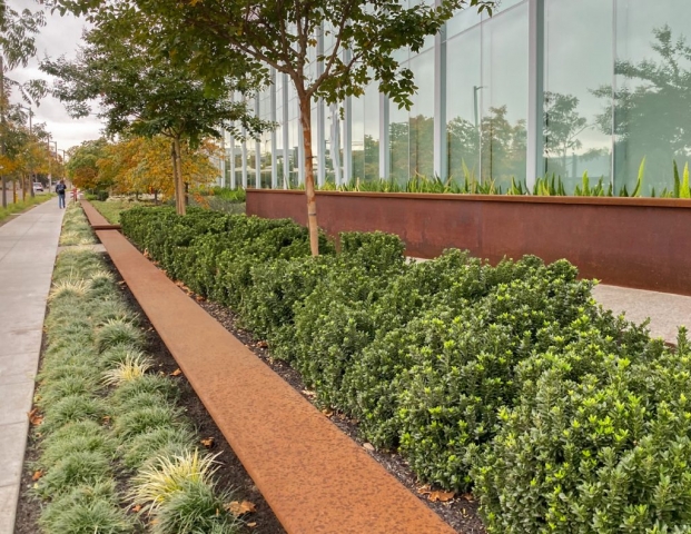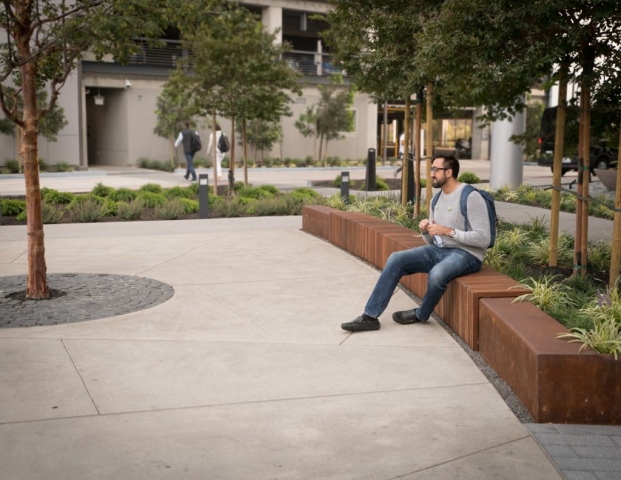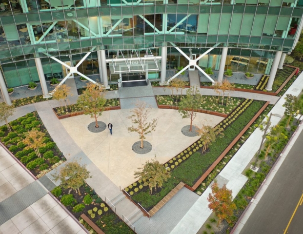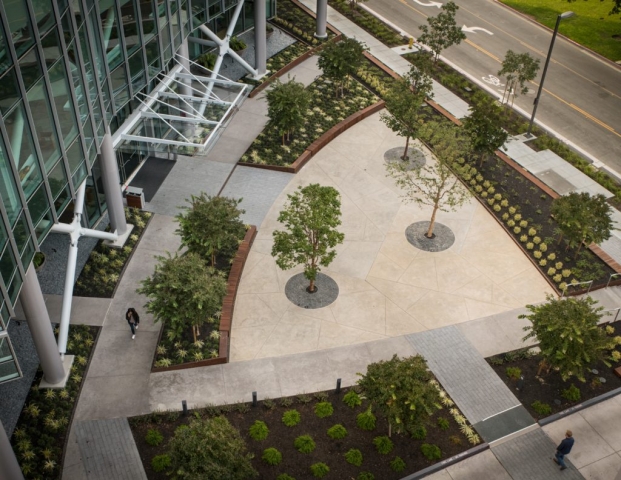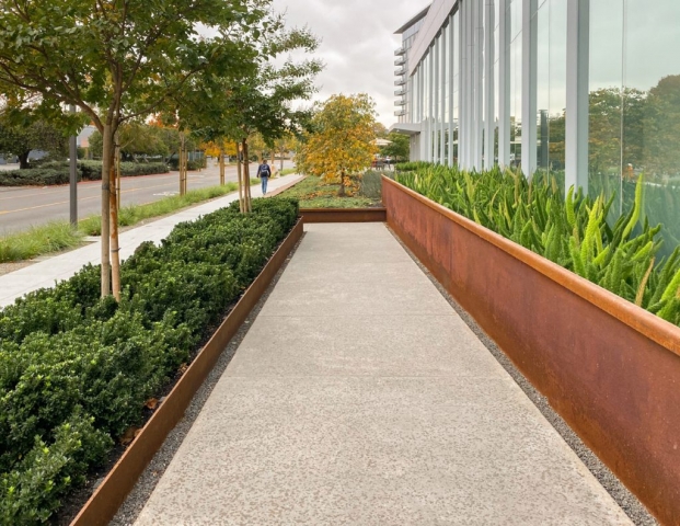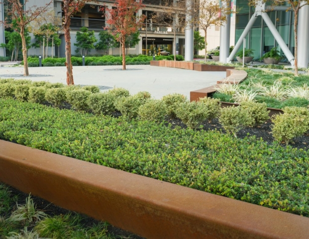 As the first phase of a new high-tech campus, the primary goal of this landscape project was to seamlessly link an eight-story office building, adjacent parking garage, café, and fitness center. Utilizing a unifying materials palette, bold forms, and an elegantly simple planting scheme, the landscape design organizes the site’s complex constraints into a dynamic arrangement of comfortable plazas, walkways, and street frontage. Stylistically different from the architecture, the landscape creates usable spaces that complement yet function independently from the site structures. The project is certified LEED Gold.