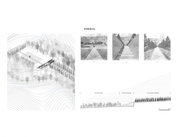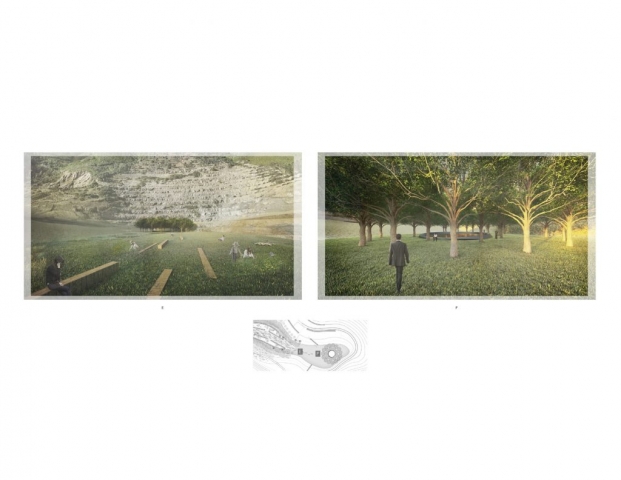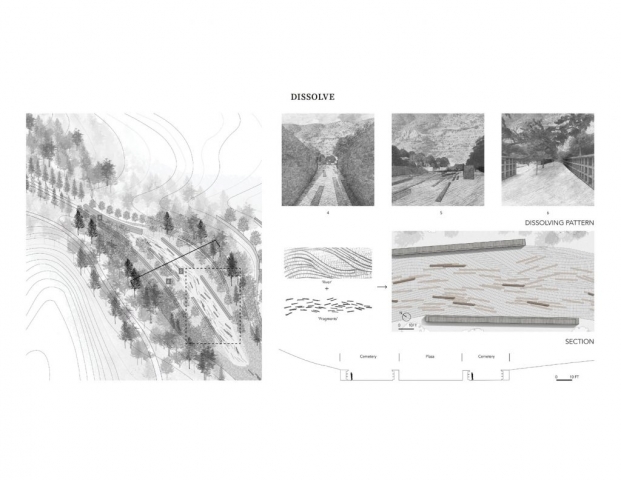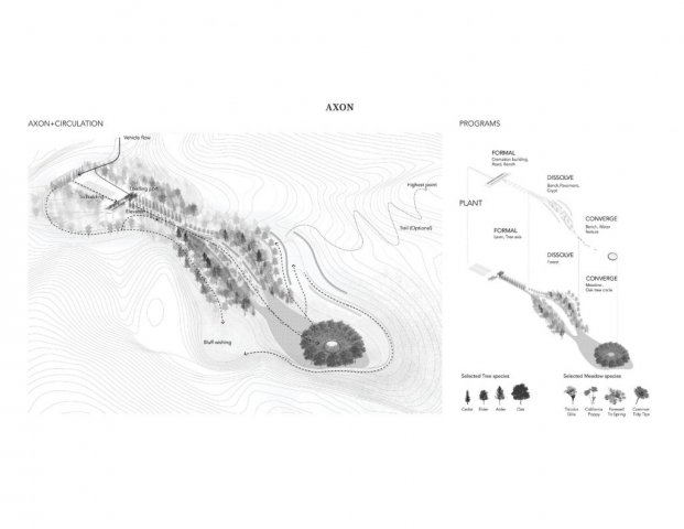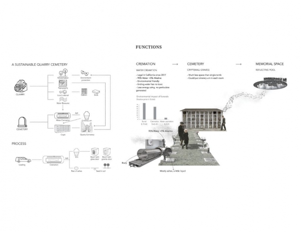 The project transforms San Bruno Mountain’s quarry into a cemetery, takes the current topography and has some regrading to transfer the quarry to a resting place- a space that keep away from outer worlds and close to nature. The aim of this memorial design is to create a place not only full of grief but also a place of hope and comfort, the pain is real, but life goes on, and we will eventually meet somewhere. The changing emotions inform the design of the space, and people will eventually feel the encouragement and comfort that landscape brings.