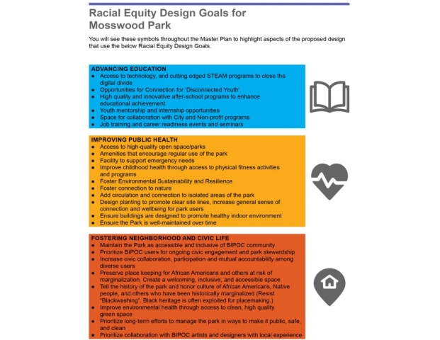 Championed by place-keeping and a definition of history and historic preservation that includes the last 50 years of social movements and community resistance to structural racism, the Mosswood Park Master Plan is an example of how planning documents can support equity, environmental justice, community stewardship, and community-based design. Beginning with a deep dive into the layers of history at the site, the Master Plan document ultimately defines a framework for planning and future decisions that was identified by the community and identified targeted goals that would promote equity, work against structural racism and disinvestment, and improve environmental justice and sustainability. The Mosswood Park Master Plan is an example of sustainable design that is rooted in equity, community and most importantly has defined measures for accountability.