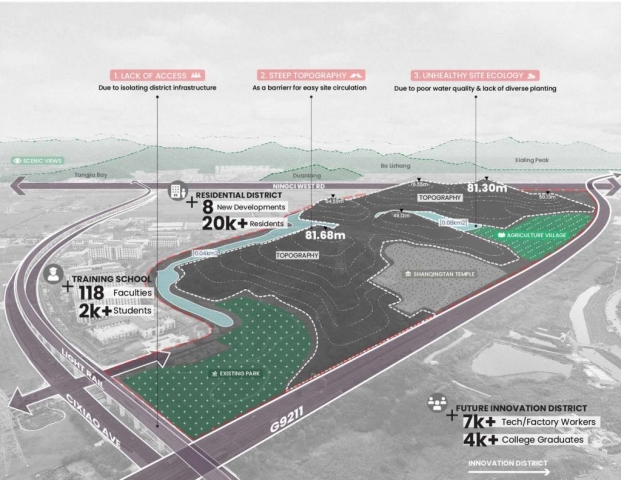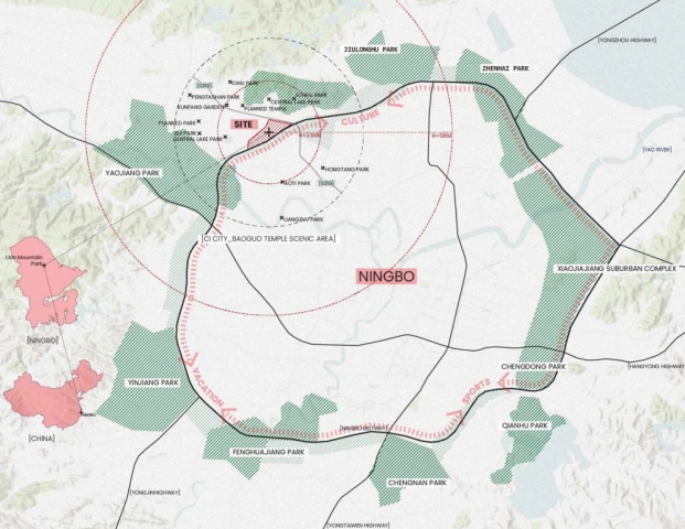Located between central Ningbo, China and nearby scenic landscapes, Ningbo Lion Mountain is poised to provide vast ecological and recreation benefits by linking local open spaces. Rising 82 meters above agricultural villages within a developing mixed-use district, the site has remained largely inaccessible. The steep topography and lack of paths has left it undeveloped but also under-utilized.