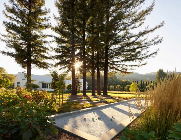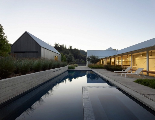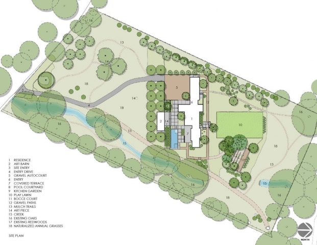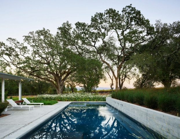 For this contemporary rural home, the clients wanted a simple architectural expression to provide a background for their collection of contemporary indoor and outdoor art. Iconic, without ornamentation or color, the home provides a foil for both art and landscape.The landscape architect worked with the client to preserve and protect the existing creek habitat on two sides of the property, the many mature native Oaks throughout, and a small existing grove of Coast Redwoods. Grading and retaining interventions were minimized. Permeable gravel autocourt and paths, and mulch trails allow for percolation of rainfall, and bioretention features planted with natives help to slow and filter the concentrated roof runoff. Planting and irrigation were limited to the areas immediately surrounding the buildings, leaving 60% of the site in its existing state of naturalized annual grasses, un-irrigated and mowed only as needed for fire safety. A simple palette of uncolored board-formed concrete walls, concrete coping and large concrete paving pads with gravel joints set off the dark interior pool, and let the architecture and the plantings shine.