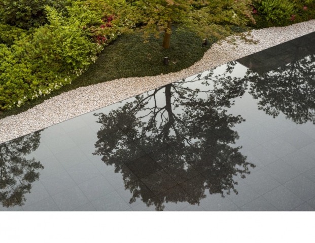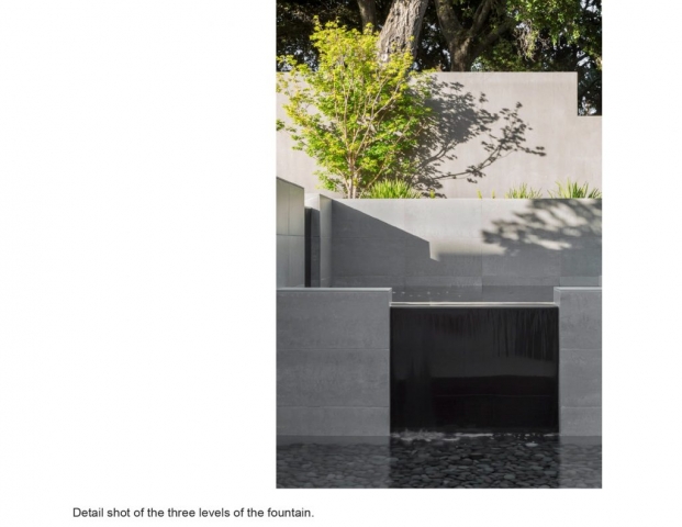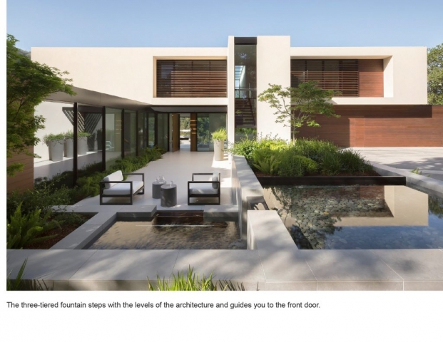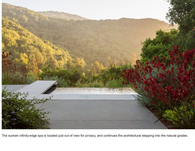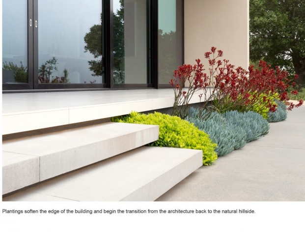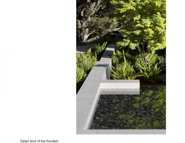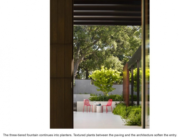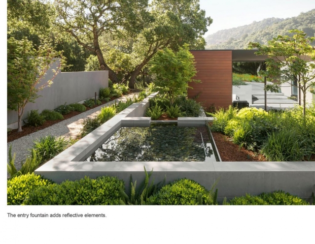 Sited in the midst of an oak woodland in the Los Altos Hills, the striking modernism of Slot House called for a decisive but restrained approach to its landscape plan, with colors and textures that stand up to the home’s bold forms yet soften its angularity. A minimal palette of warm tones on the house and paving, pops of red in plants and an architectural fountain, and a living roof with a succulent garden add interest and invite exploration while deftly integrating the home into its hillside site.Hardscape, plantings and a three-tiered fountain direct arrivals from the auto court through the home as it descends on its sloping grade, then outside again to an expansive view into the Foothills Open Space Preserve. Porcelain tile terraces and patios, a fire feature and infinity-edge hot tub extend the living spaces and offer varied experiences for large gatherings as well as intimate moments. Gravel paths leading to a secluded seating area and bench overlook offer a sense of discovery and maximize exploration of this special site.