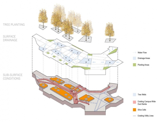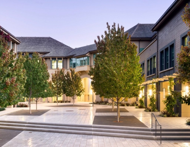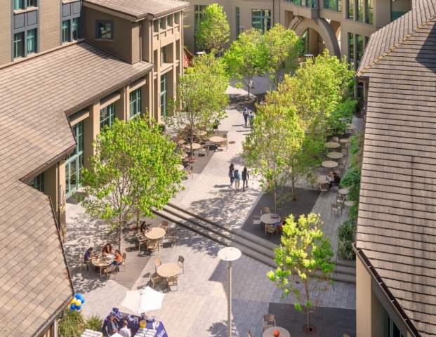 Chou Hall, dedicated by Janet Napolitano and declared the “greenest academic building in the United States,” caps the two-phase reconceptualization of the Haas School of Business and updates architect Charles Moore’s final work. The building complex, nestled in the hills at UC Berkeley, embodies many of Moore’s postmodern themes, and includes a rambling series of courtyards and rooms stepping down a steep slope. His courtyard design offered frequent spatial divisions defined by raised planters, which incorporate a variety of curves and angles. While the informality of these planters fostered spatial intimacy, it no longer accommodated the diversity of programming required by the growing school. To modernize Moore’s intimate courtyard spaces, strengthen the civic core of the campus, and accommodate a growing student population, the landscape architect focused on openness and programmatic flexibility, so that the business school could accommodate large gatherings such as commencements and fundraisers, while improving the heart of the school as an intimate civic and collegial space.
