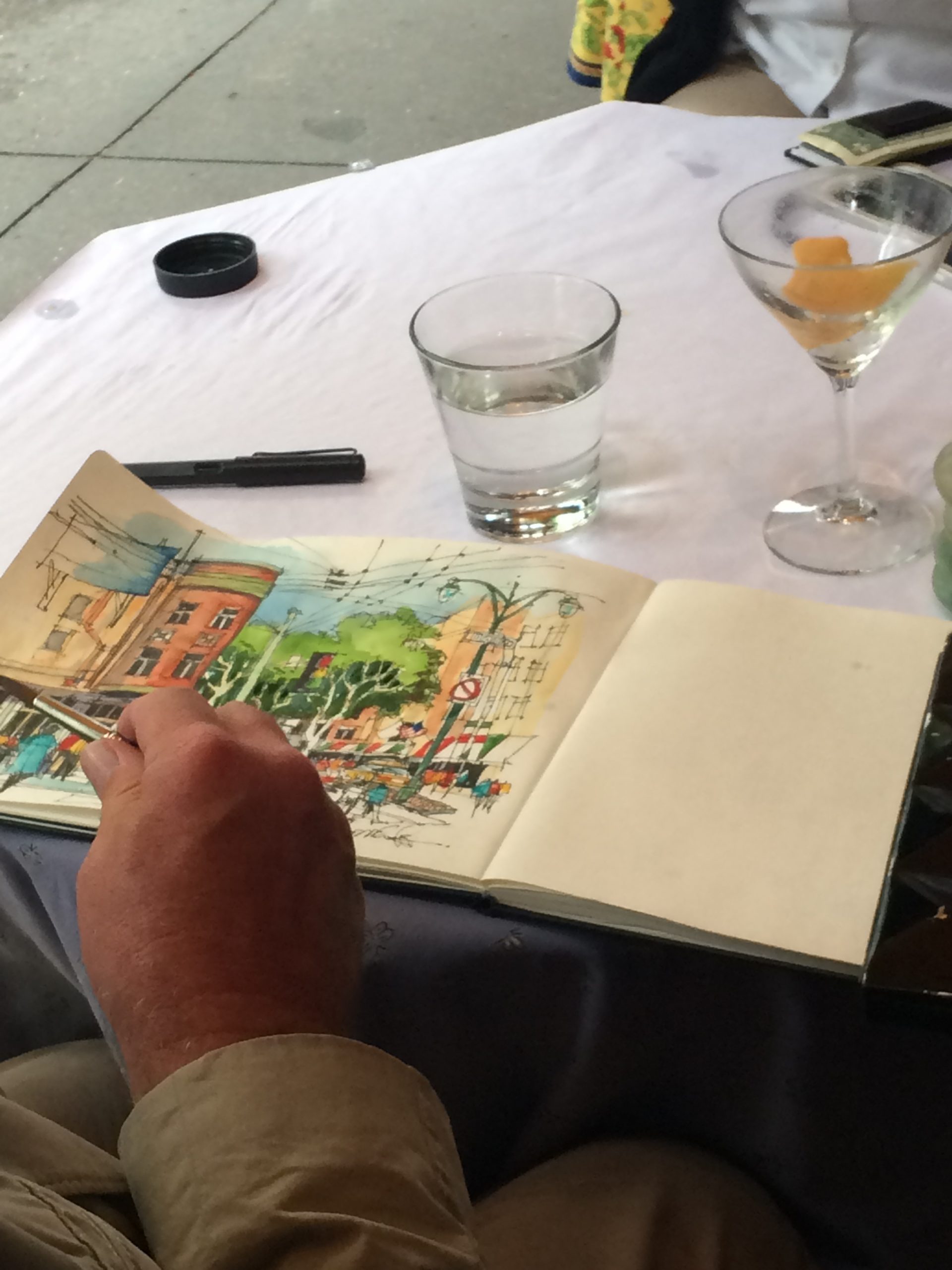 meeting back up at Tosca Caf√© for a sketch book "throw down" where everyone puts their sketch books out on a table for everyone to enjoy each other's works, including the passerby's in the caf√©. Much celebrating of our accomplishments (thanks M & J) and each other's good company ensued as we tossed back libations – relaxing easily into the evening hours before heading off into the glorious sunset. Yes, the rain had finally stopped.